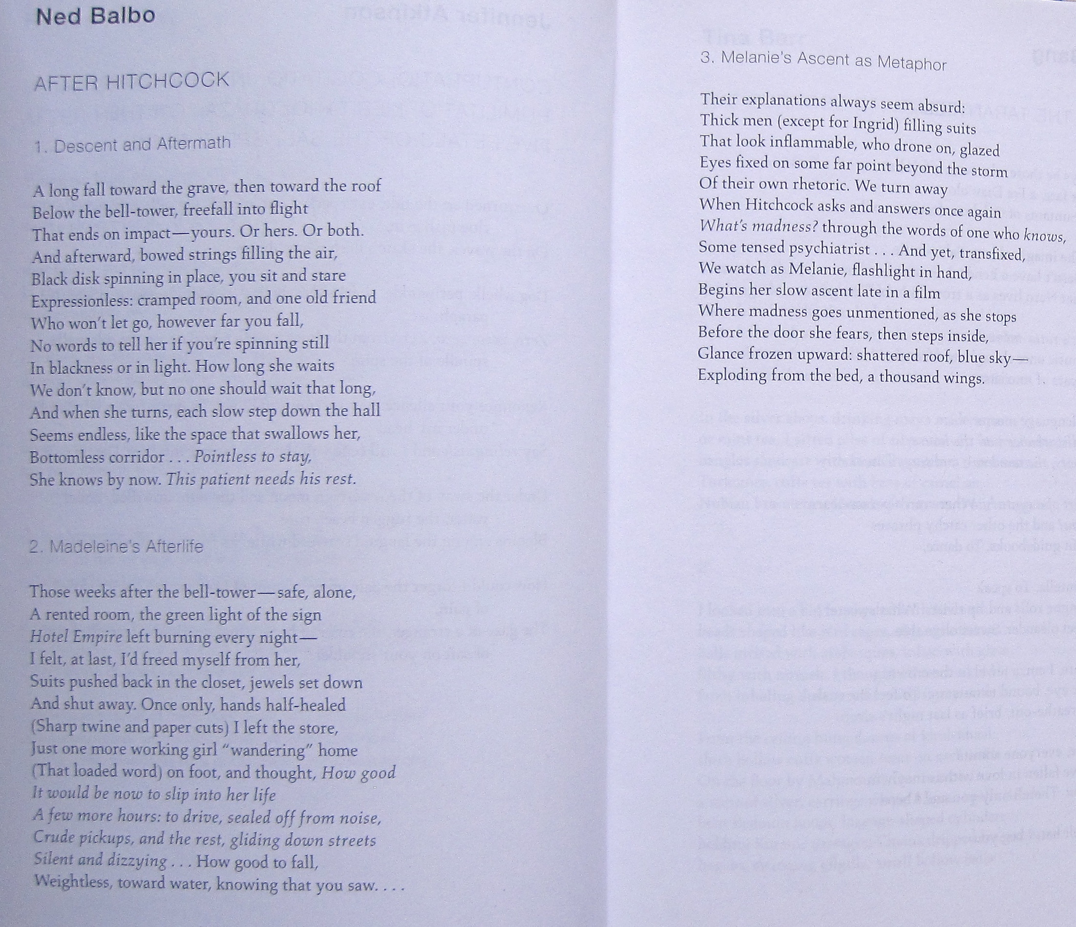Poems inspired by Alfred Hitchcock's Vertigo and The BirdsThese appear in my second book, Lives of the Sleepers (U of Notre Dame, 2005) and were later reprinted in Notre Dame Review: The First Ten Years, John Matthias and William O'Rourke, editors. -