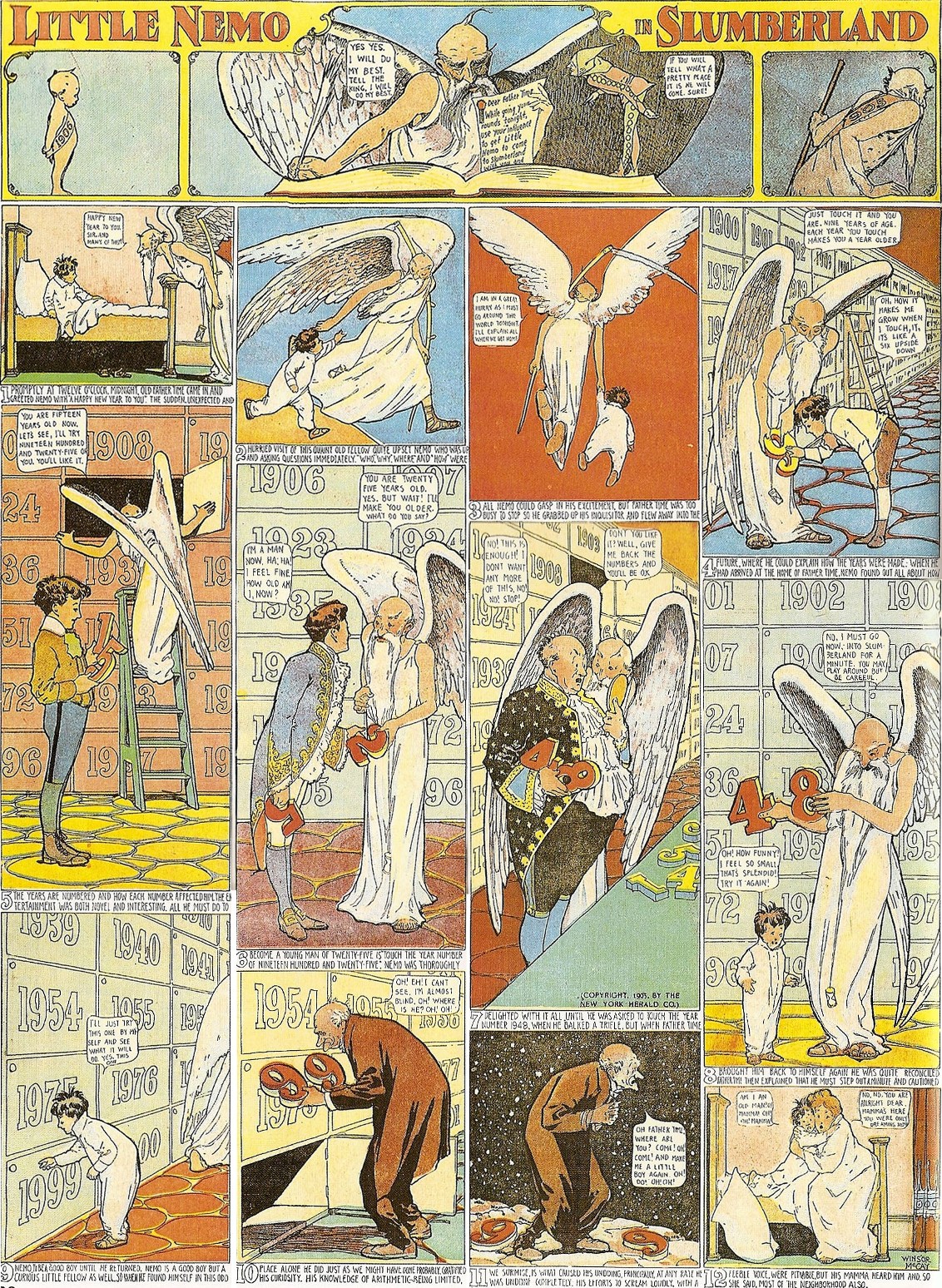 little-nemo-1906.jpgA Sunday page from Winsor McCay’s beautiful and innovative early twentieth-century comic strip “Little Nemo in Slumberland.” McCay’s imagination, composition, and use of color are awe-inspiring. (Image in public domain.) -