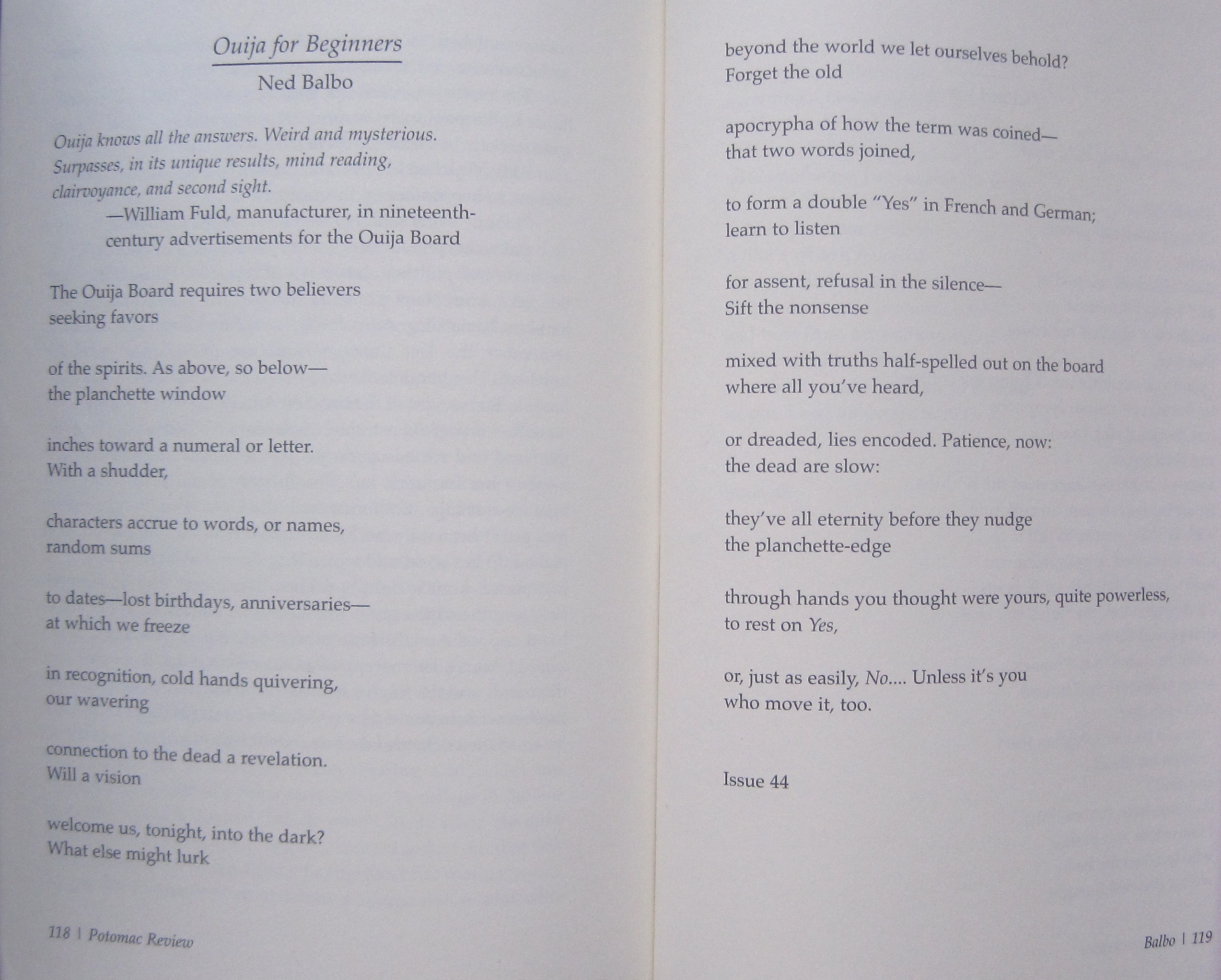 Ouija for Beginners, from Best of Potomac Review, Fall 2011The poem (written in split couplets) tells us how and why to use Ouija Board, as well as why we can't always trust what we discover. Poems, I like to think, reach the living and the dead, though we can't always trust them either, -