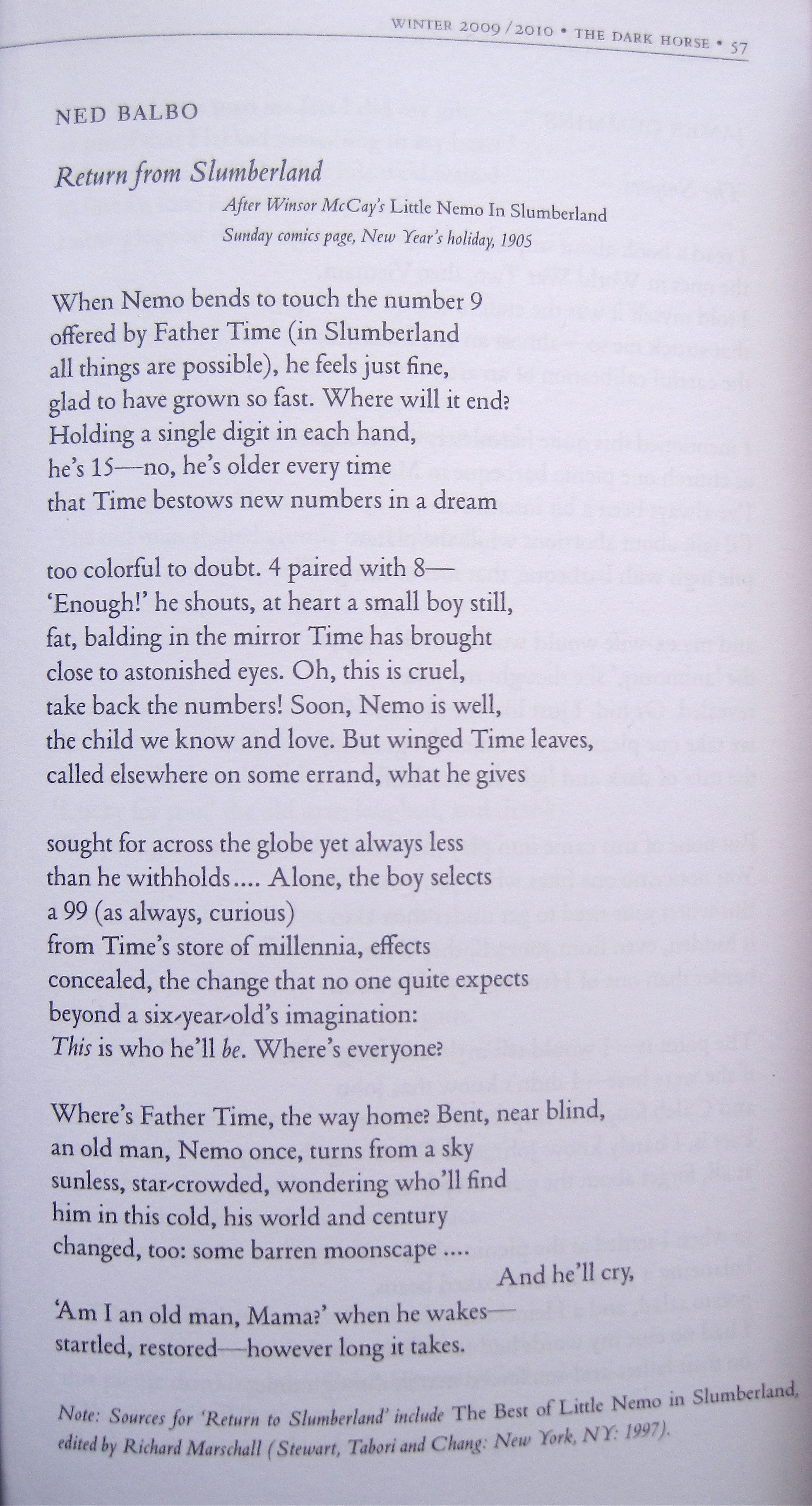 Return to Slumberland, from The Dark Horse, Winter 2009/2010Nemo isn't the only one who knows how swiftly time flies, how abrupt its transformations... The stanza form is rime royal, used by Chaucer and Scotland's James I. The rhyme scheme (mostly slant in this case) is ababbcc, as the form requires. -