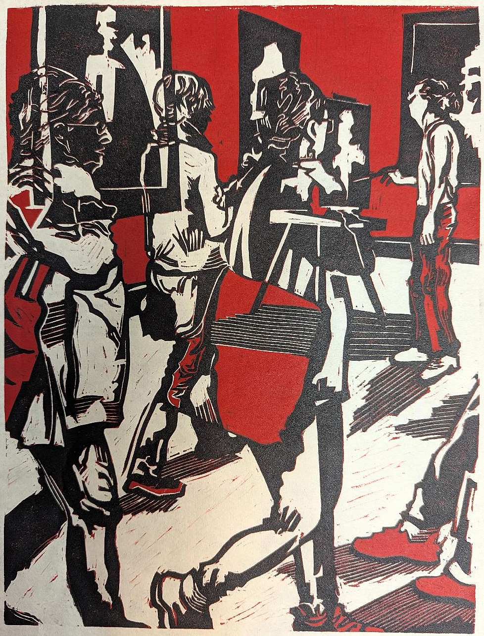 Focused and Fleeting (Red)With this print I experimented with a variety of color ways, and a final printing using only the black and no color. I also used a multitude of lines, shapes and marks that are unique to block printmaking based on the process of carving away the negative areas of a block to ink only the raised area of the block.