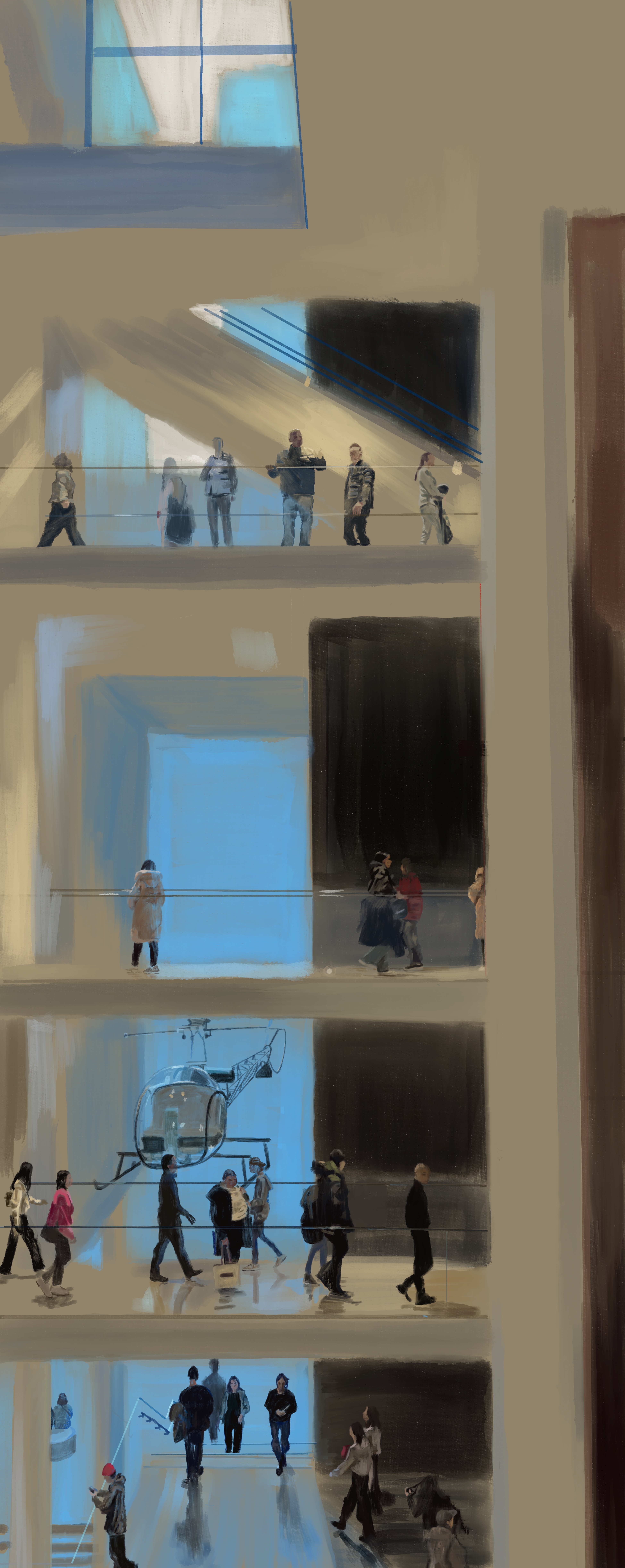 Many of these images are composites of multiple photographs, which are then used as references as I layer the photographs to create a finished composition that is digitally painted. The movement, overlapping images and solitary figures are culled from multiple images to be included in a final composition. Some of the artworks are obscured, some are celebrated, and some have their scale or details changed. Art from Art, inspiration is to be found everywhere.