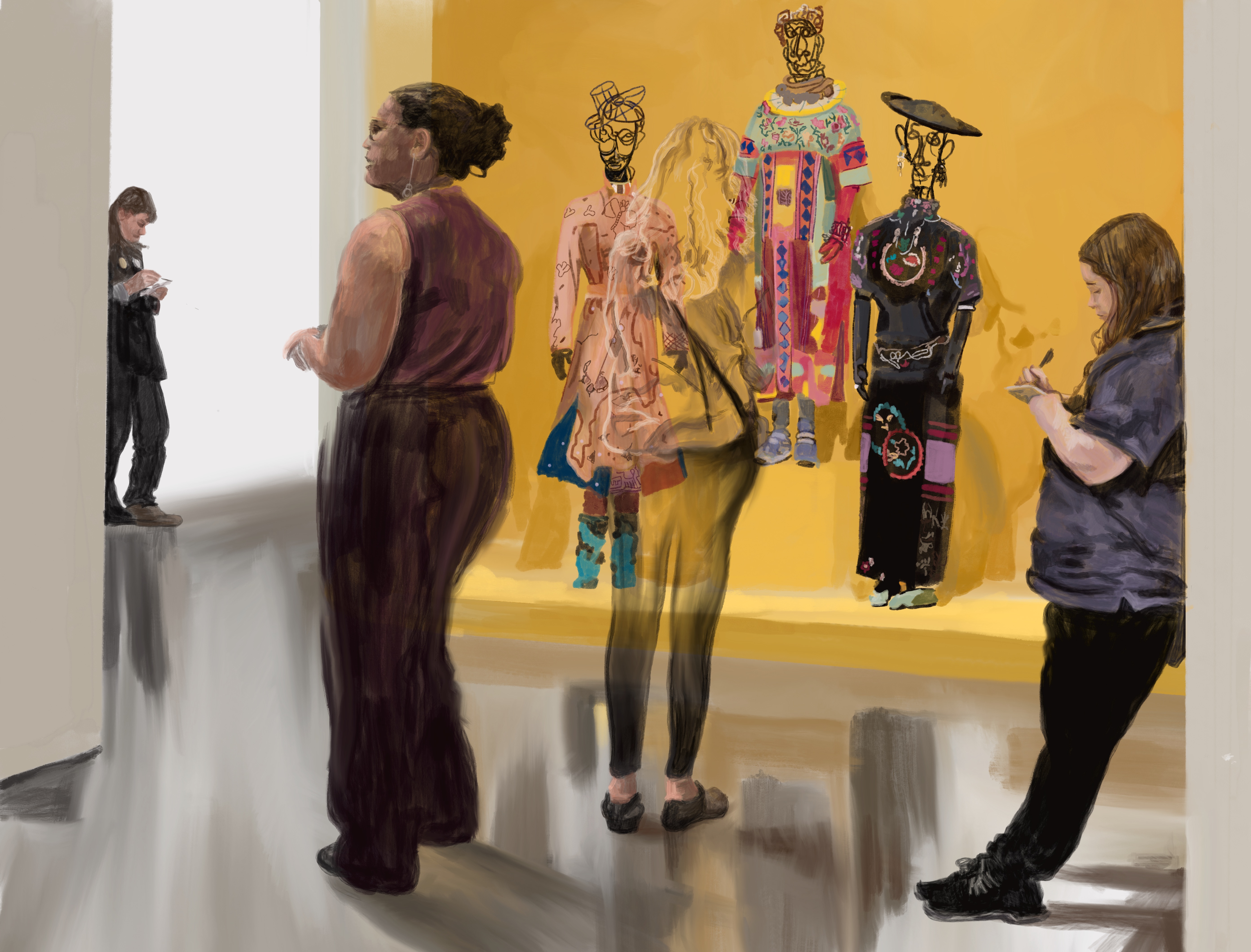 The bright yellow background in this composition draws the viewer's eye to the mannequins nwearing outfits by the amazing Joyce Scott. Guards bracket the composition with a visitor standing in front of the display while another visitor walks by.