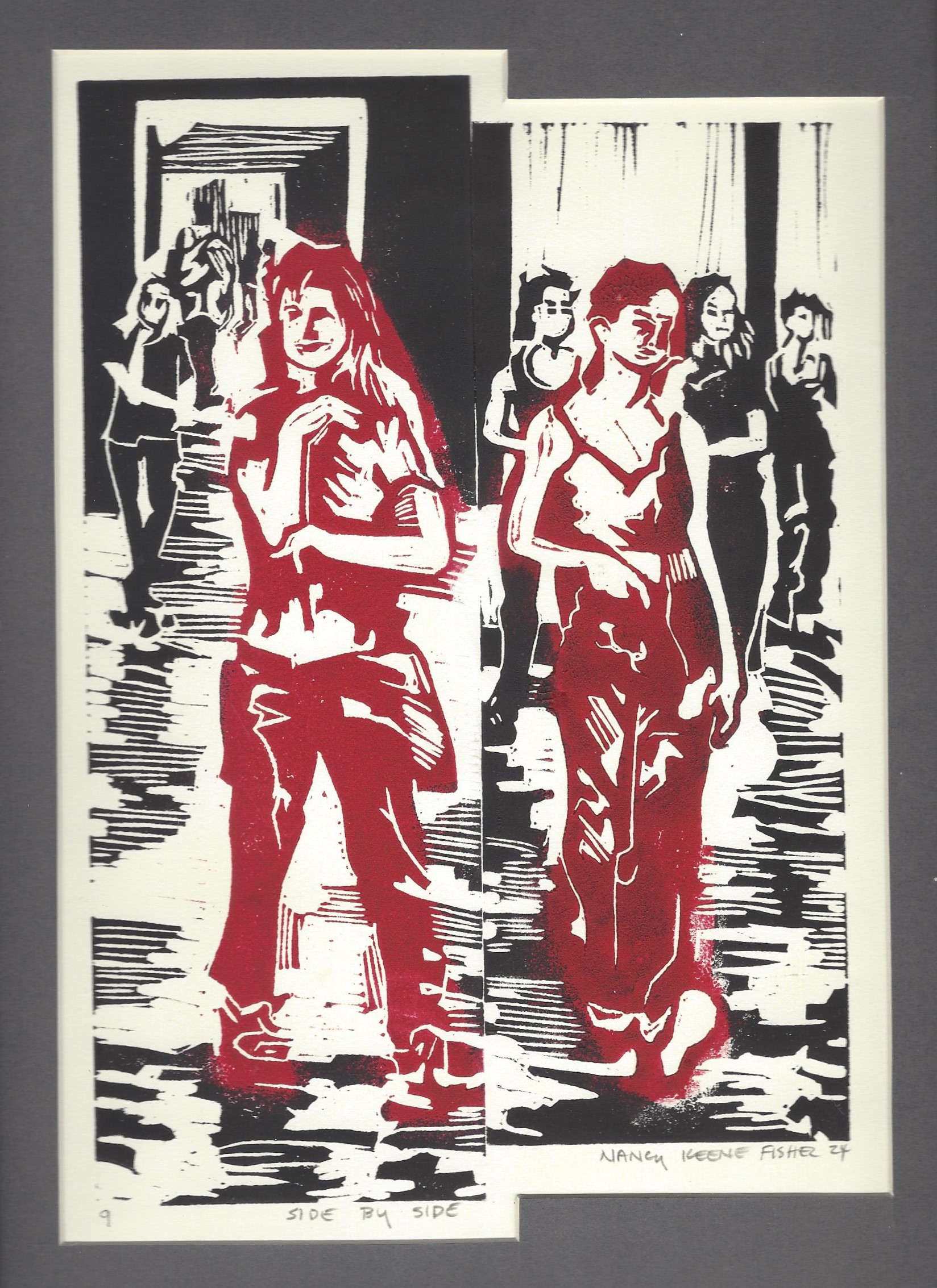 Side by SideIn side by side two women are shown as they meander through a gallery, moving closer to us as the viewer. This finished image is a diptych, using two blocks, inked using black and red ink to bring out the female figures. This method allows me to create varied editions, where the final image can be changed and manipulated with each printing.