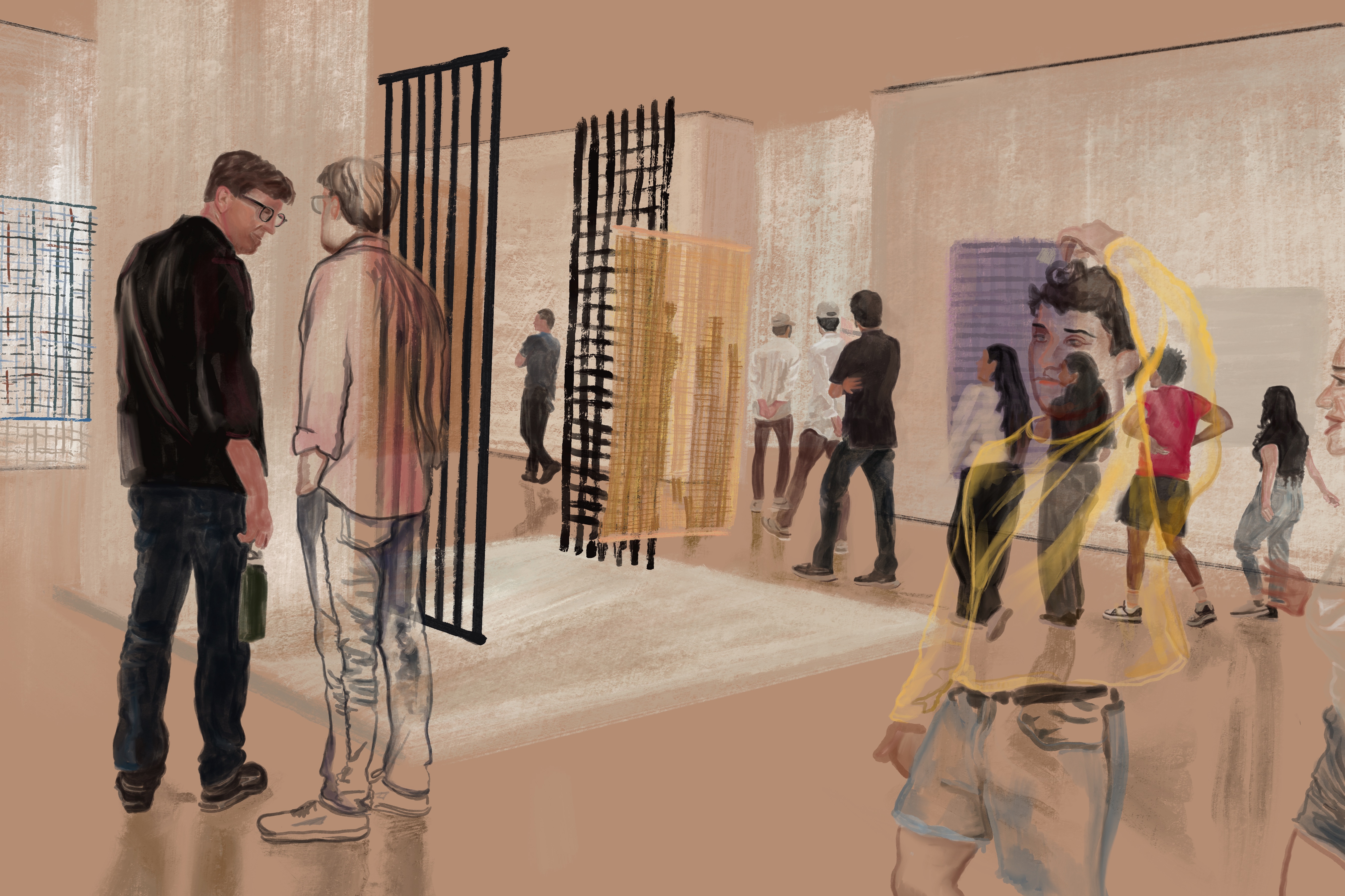 I love to visit museums when I travel, and have certainly been moved, educated and inspired by exhibits I have seen. However, I also have become enthralled with watching how other people experience these public spaces; how they look at the art, move through the spaces, interact with other visitors, and become a dynamic part of the museum experience. This is what I have strived to document in this series of digital paintings.