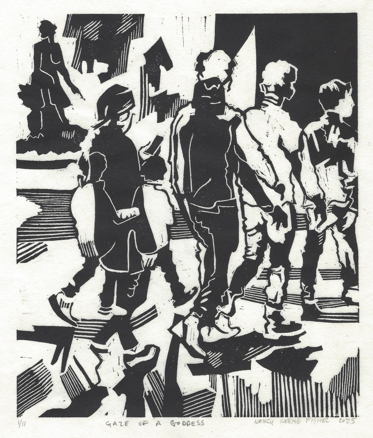 Gaze of a GoddessThis print shows a sculpture in front of a window, with a woman, child and man shown multiple times as they move across the space. Their figures are shown as solid forms, linear images and partial figures.