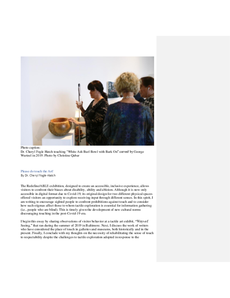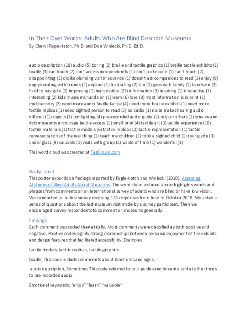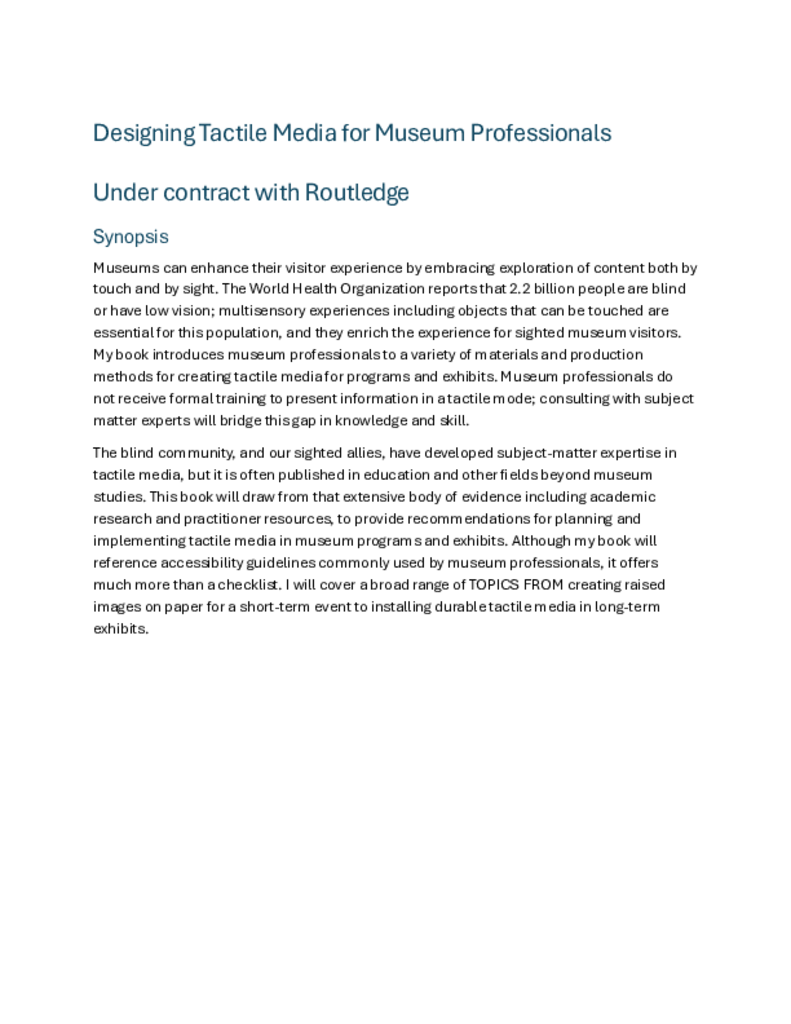 Dr. Cheryl Fogle-Hatch is a nonfiction author working at the intersection of lived experience as a blind person and academic research in anthropology and museums. She is writing under contract with Routledge; Designing Tactile Media For Museum Professionals will be published in 2028. Dr. Fogle-Hatch founded MuseumSenses LLC, a consulting business that helps museums develop multi-sensory exhibits for everyone. Creating exhibit content with tactile and audio components engages blind people… more