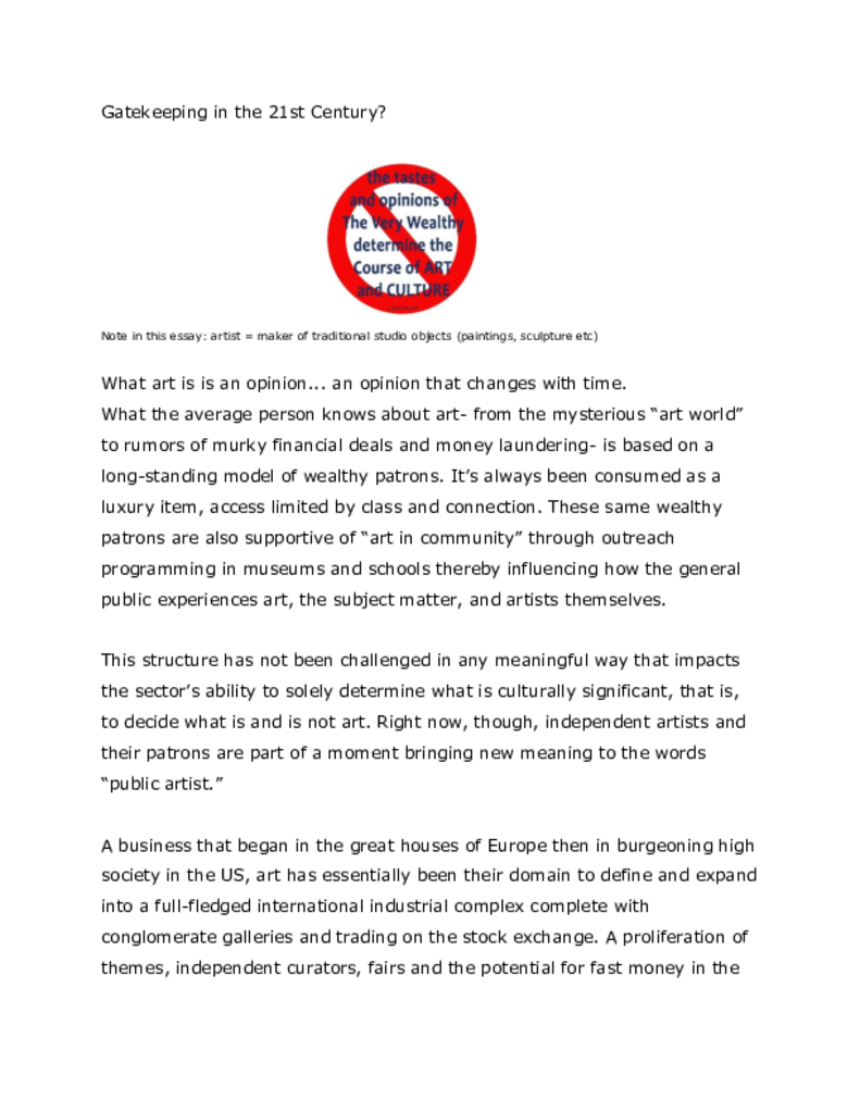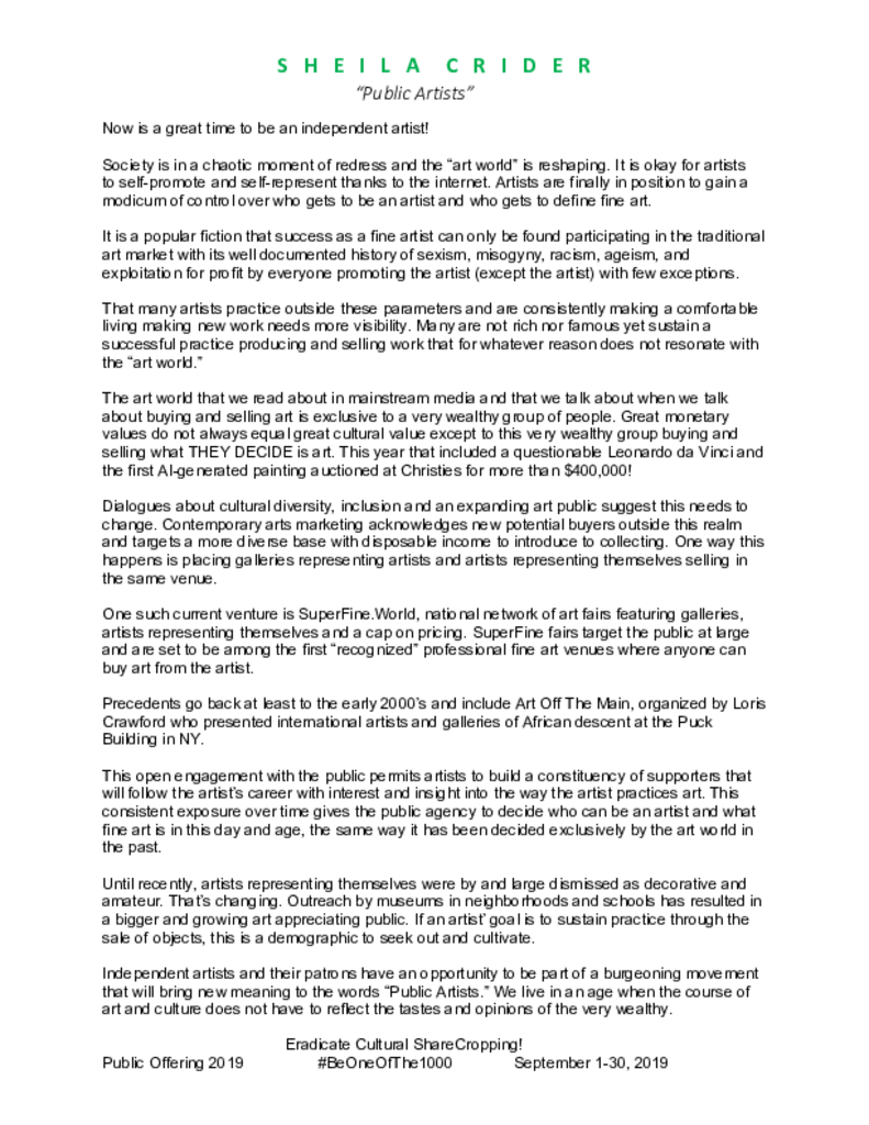 "Eradicate Culltural Sharecropping" grew out of "Initial Public Offering ," a 2016 crowd-funding campaign advocating for general public support of individual artists' practice through subscription or one time donation. Iterations have included open studio events, participation in community art sales as well as stickers and tee shirts