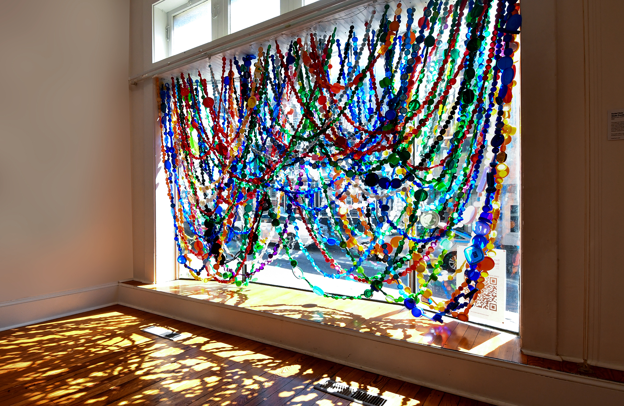 7'x13'x3'Shade Provider repurposes discarded plastics into a functional shade configuration, offering relief from heat while inviting the viewer to rethink everyday waste as objects of care. Positioned in a gallery window, the sculpture sparks conversation between inside and outside, inviting the passersby to consider the practical and playful potential of transforming discarded materials.
