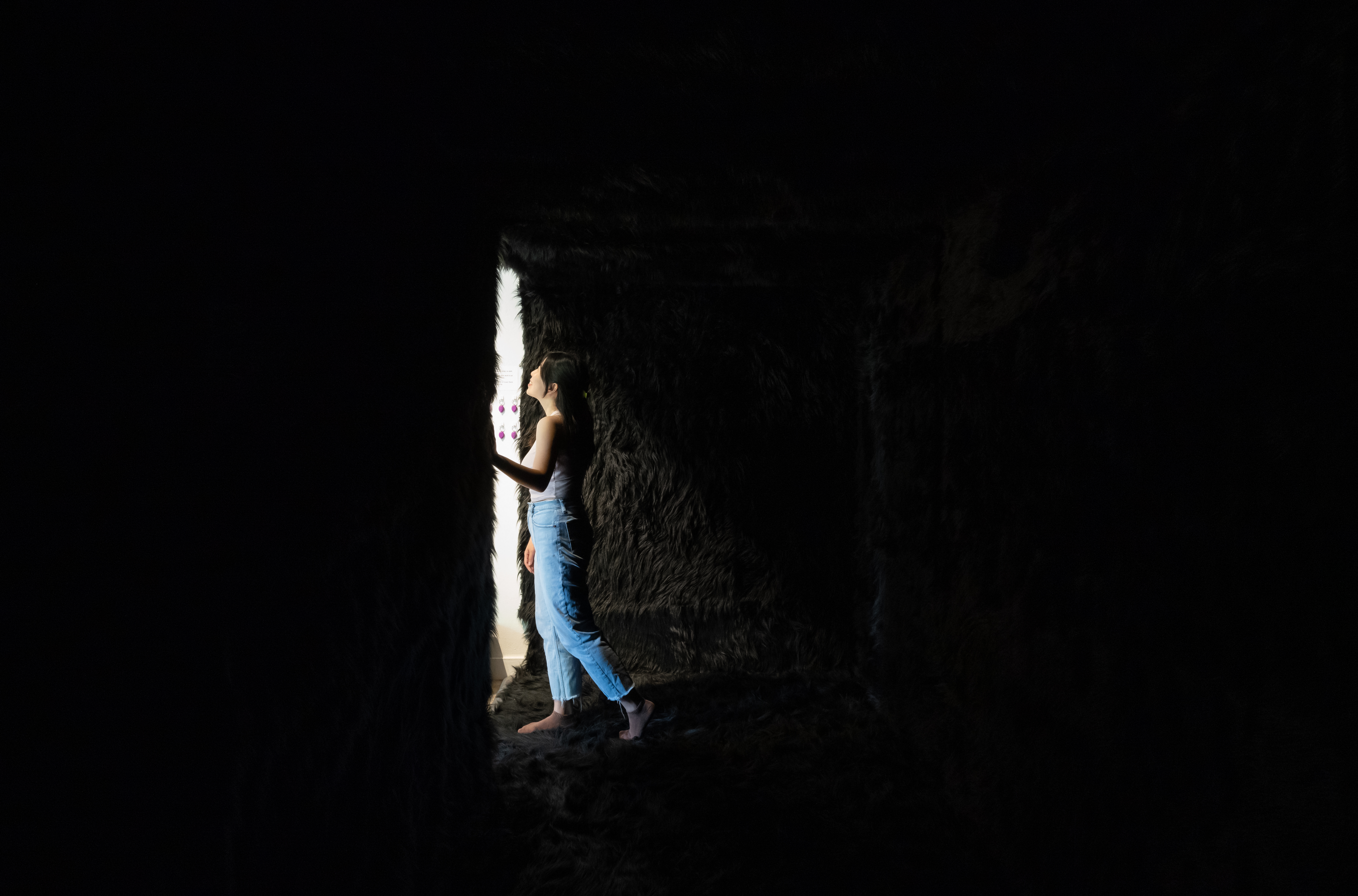 This work draws viewers into a moment of sensory bliss, acting as a threshold or transition, marking the boundary between one environment and another. The single-use plastic bags holds its own symbolic significance and invites viewers to reflect on the implications of our material world. As viewers linger through the single-use plastics, they are met with unexpected yet pleasurable sounds, textures, and visuals that offer new sensibilities for reframing our bodies with plastic.