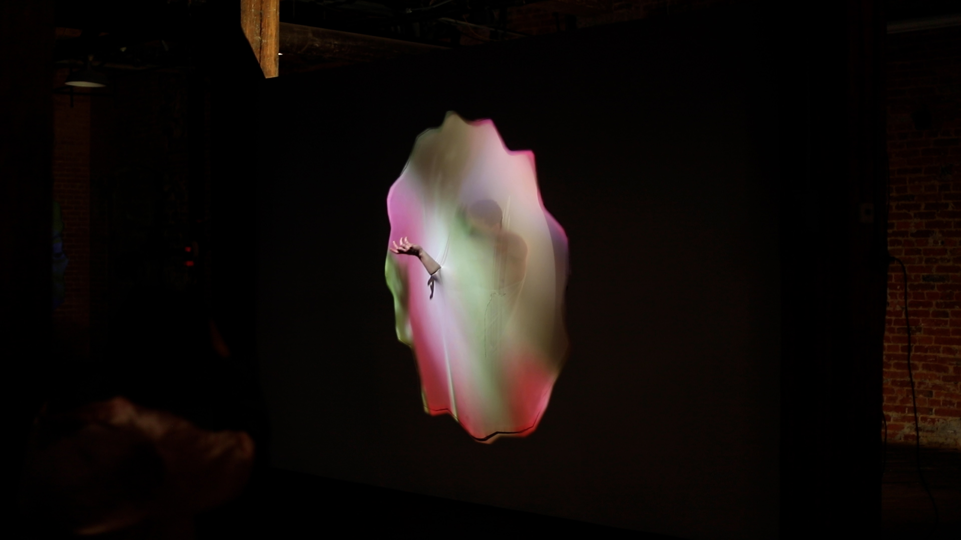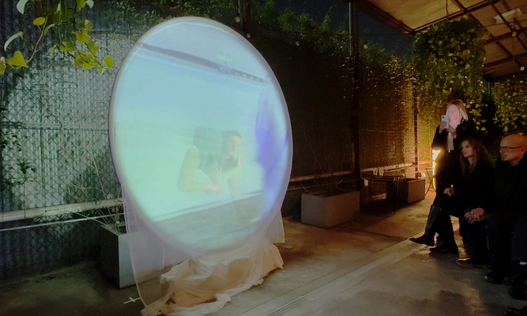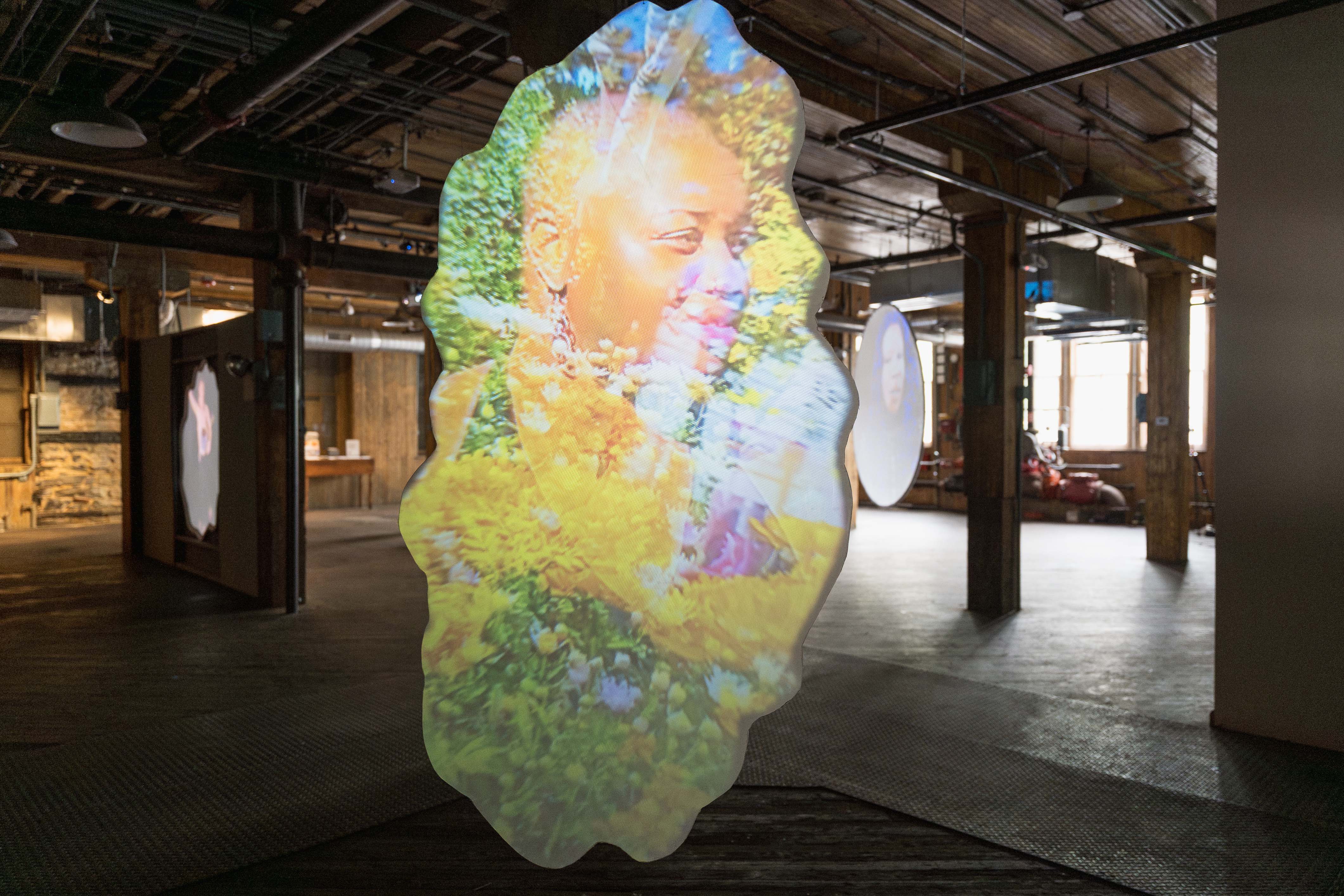 Paradise Portals weaves together performance documentation, drone footage, livestream video, and green screen technology to create portals between seven performers’ bodies and the environments that hold personal significance for them. Set within the historically preserved industrial space of AREA 405, the projections loop across multiple custom cut plexiglass screens creating the illusion of portals floating in space. Each week, audiences are invited to experience live performances that unfold simultaneously with the illuminated moving images.
