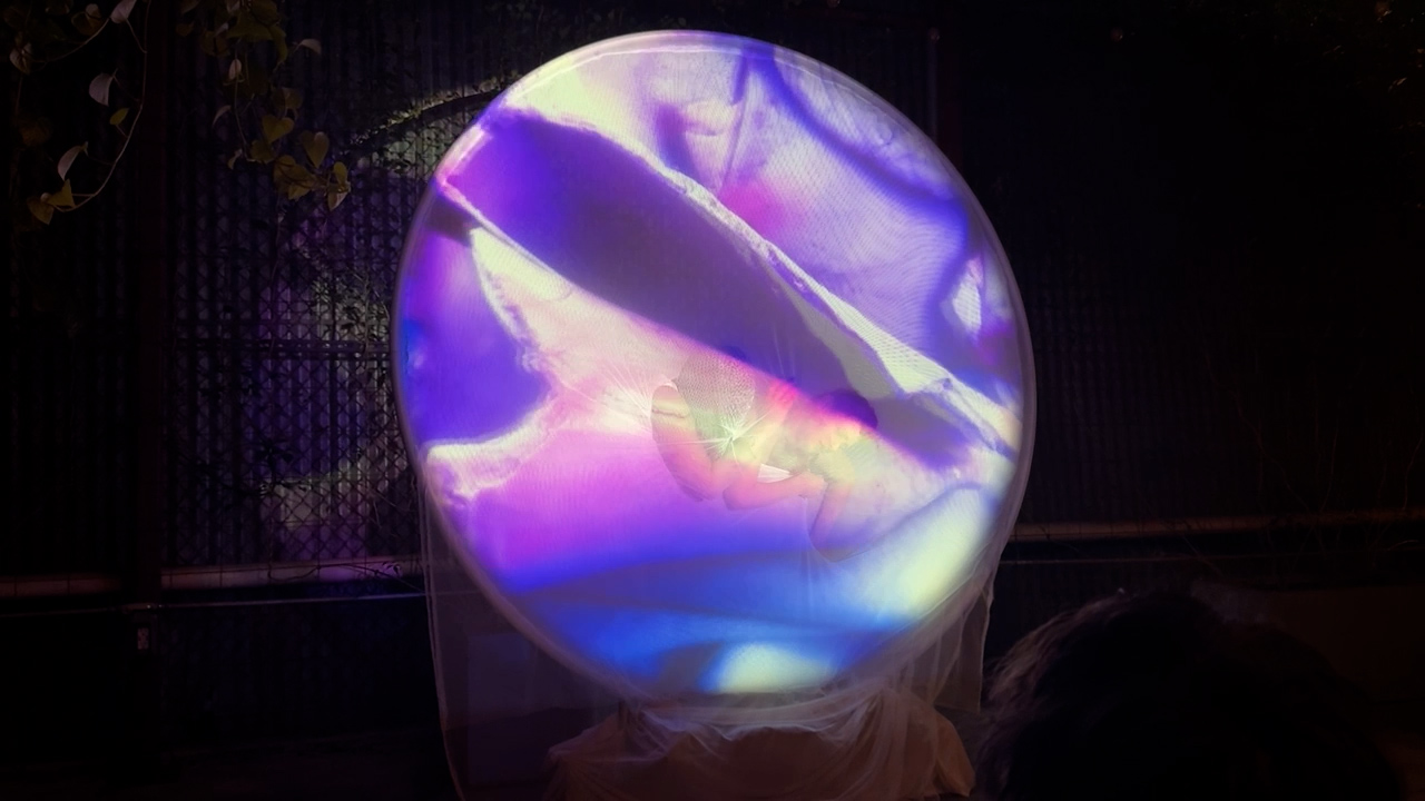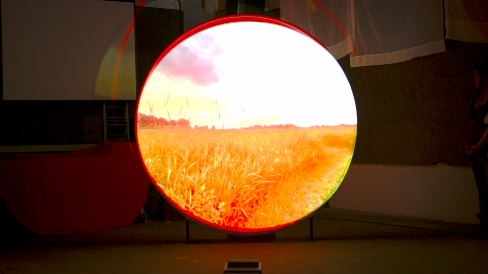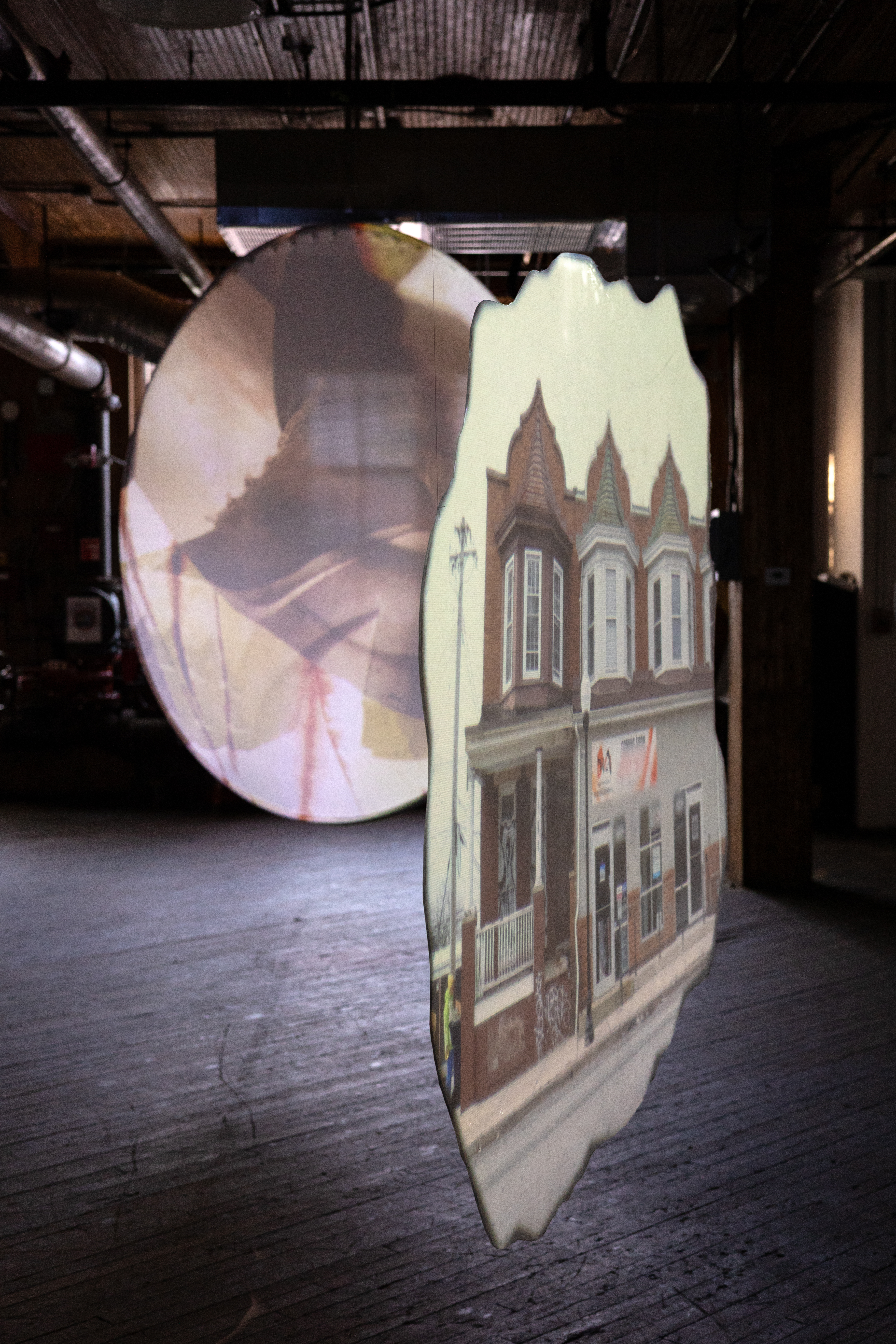 Paradise Portals weaves together performance documentation, drone footage, livestream video, and green screen technology to create portals between seven performers’ bodies and the environments that hold personal significance for them. Set within the historically preserved industrial space of AREA 405, the projections loop across multiple custom cut plexiglass screens creating the illusion of portals floating in space. Each week, audiences are invited to experience live performances that unfold simultaneously with the illuminated moving images.