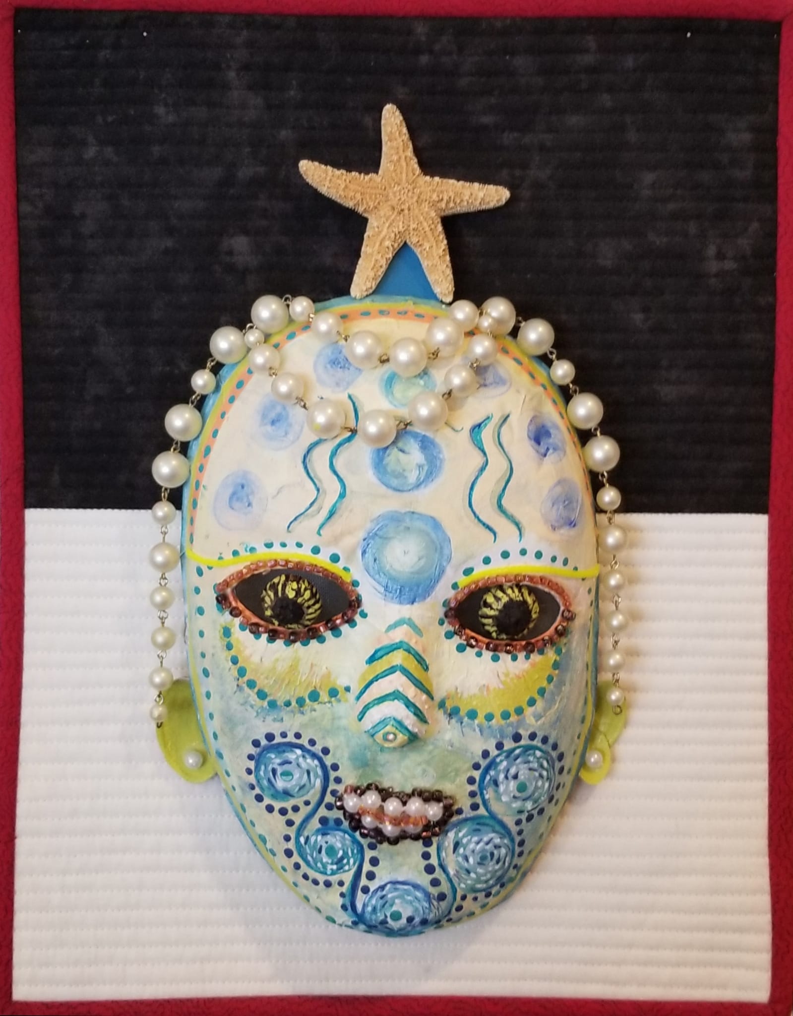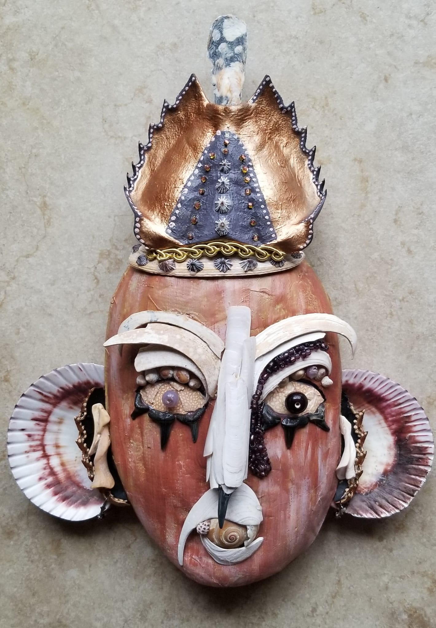 Topsail GoddessJust as the expressive arts are used to exemplify our essential humanity, we are also motivated to associate with, and feel most comfortable with a tribe of our own. This mask, with a tribal feel, represents my family tribe from Topsail Island, North Carolina. The found-objects in this assemblage come from that best-of-all-beaches, where a walk along the beach indulges my artist's sense almost everything looks like art supplies, especially the hard shell of a horseshoe crab. This multi-media work measures 12.5" X 9.4." -