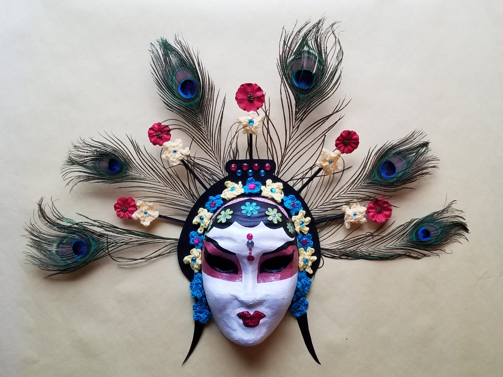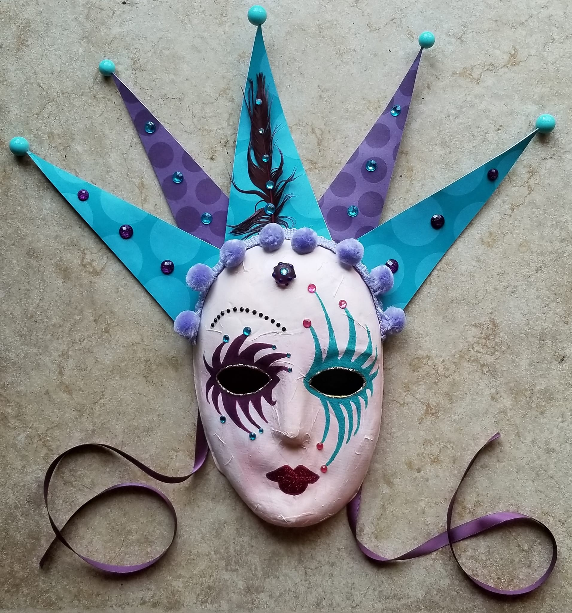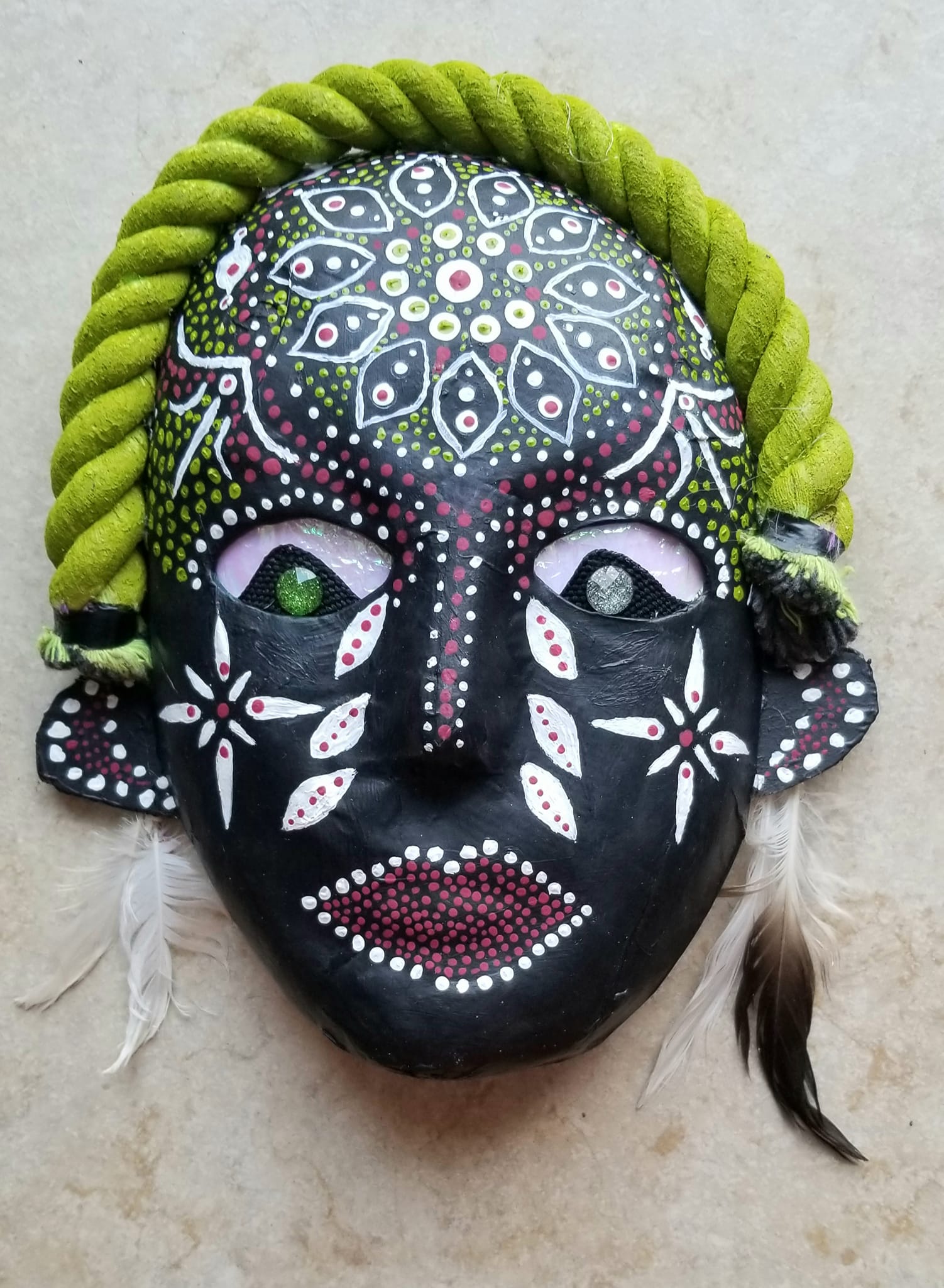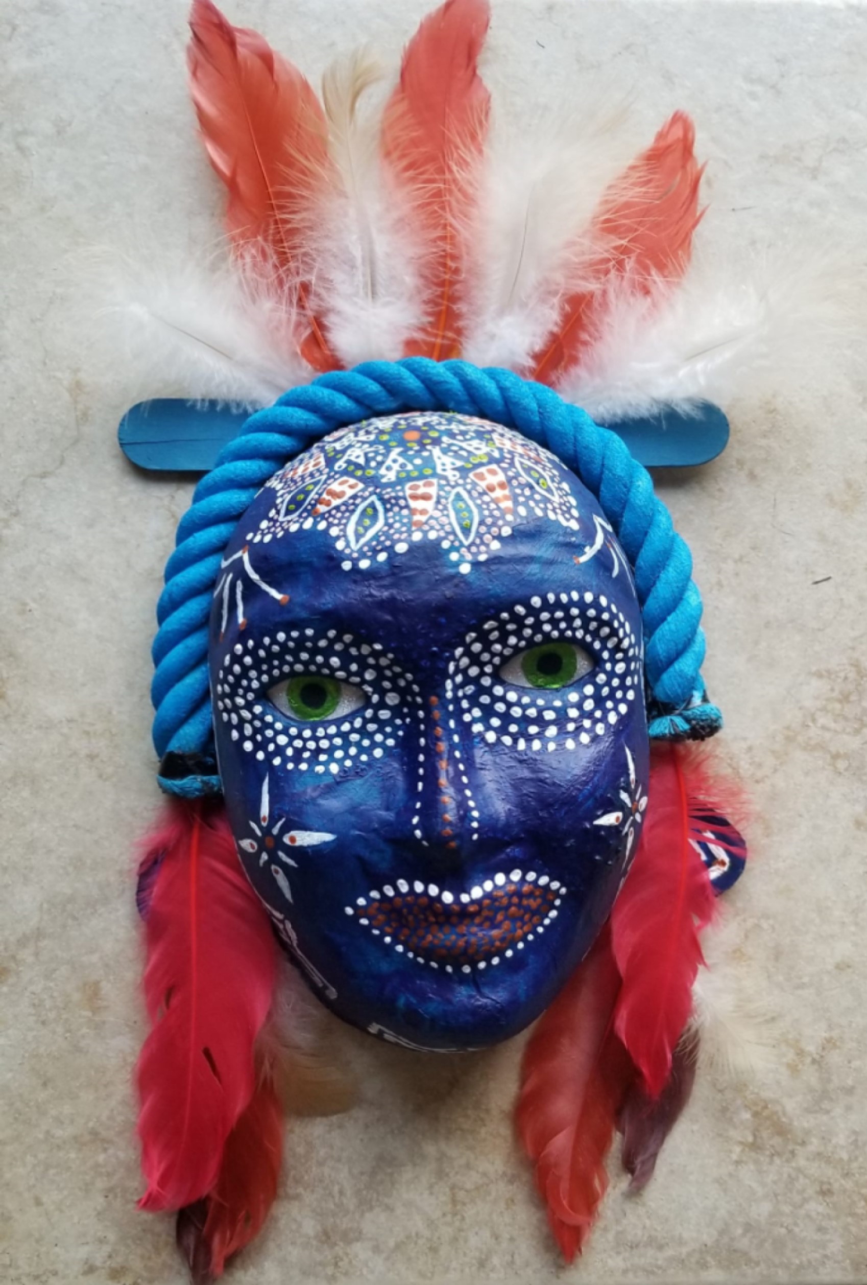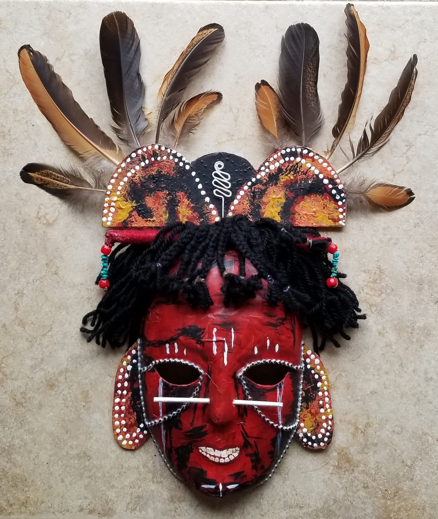 In our human endeavors, we use masks for both social and expressive reasons. They are used for funeral or fertility rituals, to mold the behavior of group members through admonition or supplication, and to enhance group ceremonies that impact intra-group relationships or those with the larger world. Historically, masks are used to commune with gods and goddesses, to heal the sick, change the weather, or portray characters in plays or reenactments of mythological events. Today, masks are found at festive occasions such as birthdays and Carnival. As an artist, my interest in mask making began when my Spanish class was asked to make a mask representative of a Latin American country. That mask is included here, as well as, those it inspired. In addition to culturally relevant masks, there are masks reflective of popular genres, historical references, or imaginative characters. All are created using a paper mache base form, painted with acrylics, and enhanced with a variety of commonly available materials and found objects.
