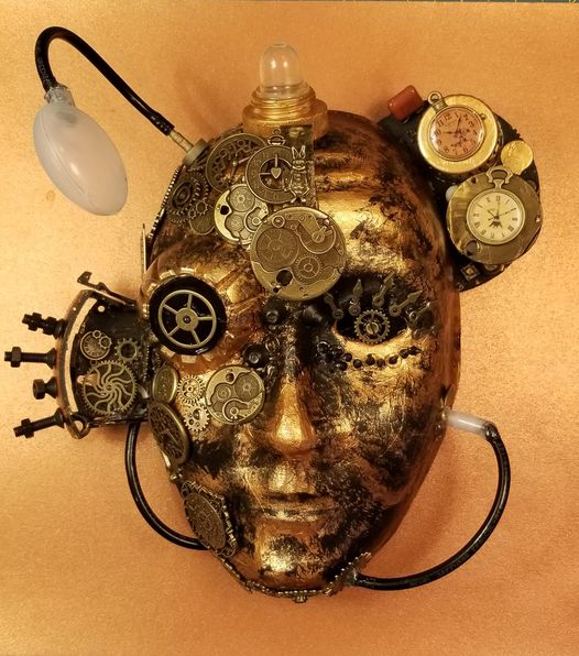 Steampunk SingerMr. Buckminster is retro, futuristic, fiction not fact, and a whole lot of fun. He recycles and can never remember what time it is, which is why he possesses so many time pieces. He is constructed on a paper mache mask, is assembled from found objects and readily available art supplies, and measures 9.5" X 9.5." -