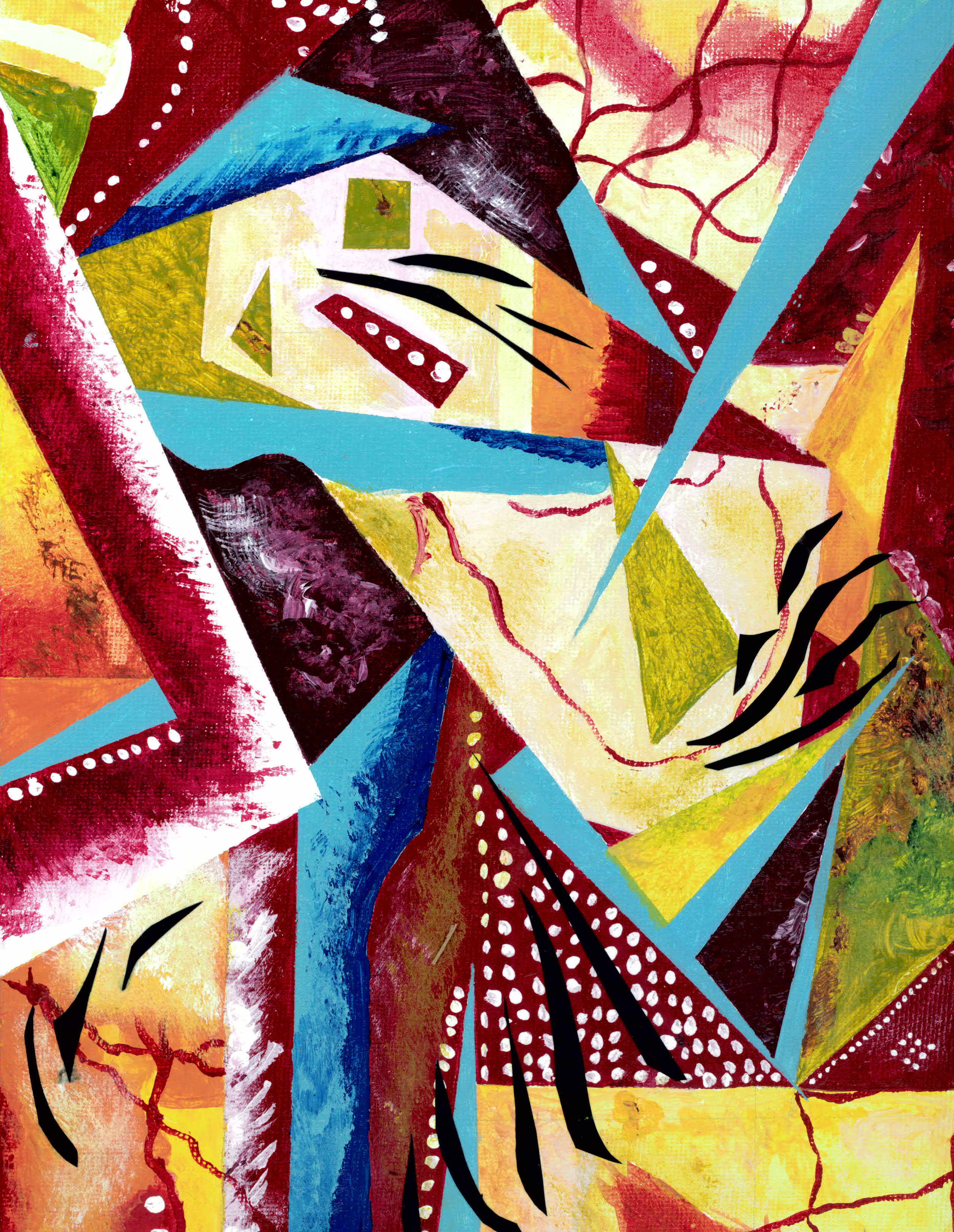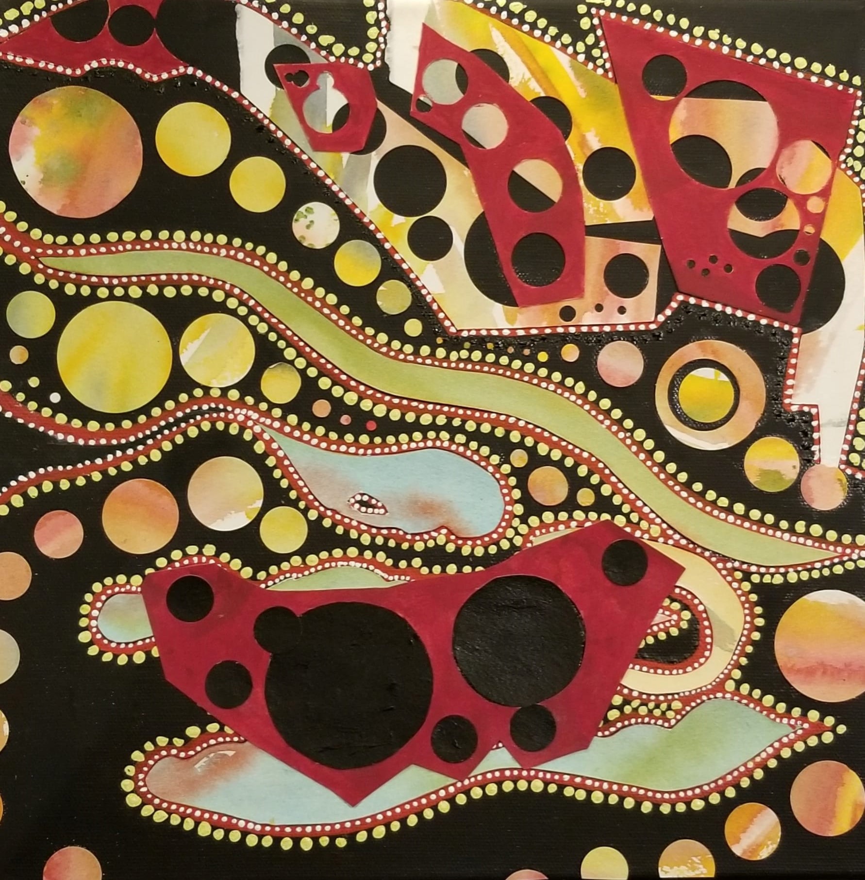Space DreamingMedium: Acrylic and water color paint, collage. Size: 12" X 12" In this painting, the artist uses dot techniques to illustrate the division between the physical and spiritual worlds. The central dividing area, crossing from left to right, suggests the division between two worlds. The round objects are suggestive of planets and the areas in blue and green suggest oceans and flowing rivers. Above the dividing line, the shapes are squared off, and the holes between the various layers suggest wormholes to alternate universes. At the bottom of the painting, a mask floats in the physical world, but the eye holes are blacked out. In Australian indigenous culture, dance and story telling are used to remove the hindrances to connecting to the spirit world. These ceremonies sometimes last 3 or more days and allow the obstacles to spiritual vision to peel from eyes looking outward and upward. -