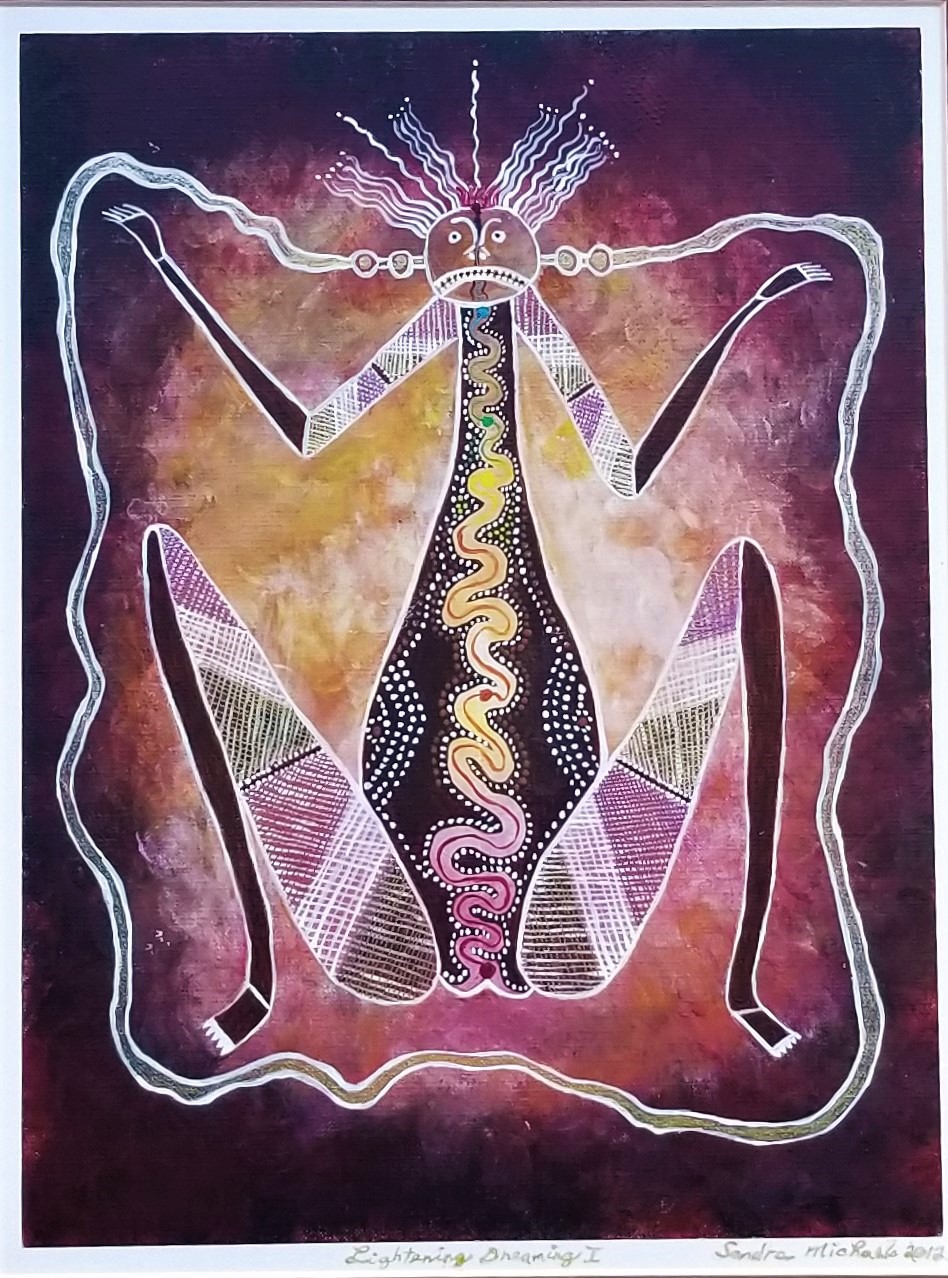 Lightning Dreaming WomanMedium: Acrylic paint. Size: 13" X 10." In this painting, a woman from the central plains of Australia is captured at the exact moment of a lightning strike. She feels the energy in her body, and her hair literally stands on end. In a nod to the multi-culturalism of our current time, her internal chakra system (Hindu) is displayed at the moment of the strike. Because of the amount of energy released, her internal pathway twists and doubles back at times. and vibrates with the lightning. She is held awestruck and awaits the rain that will awaken the grassland and turn it green. -