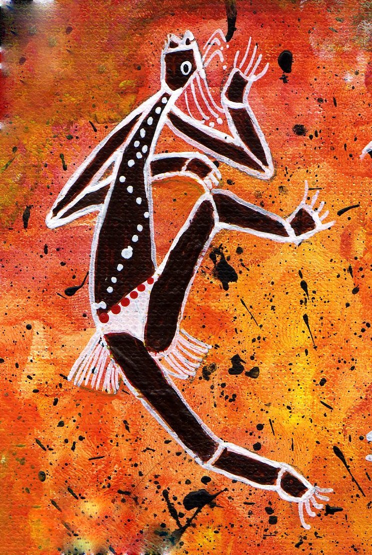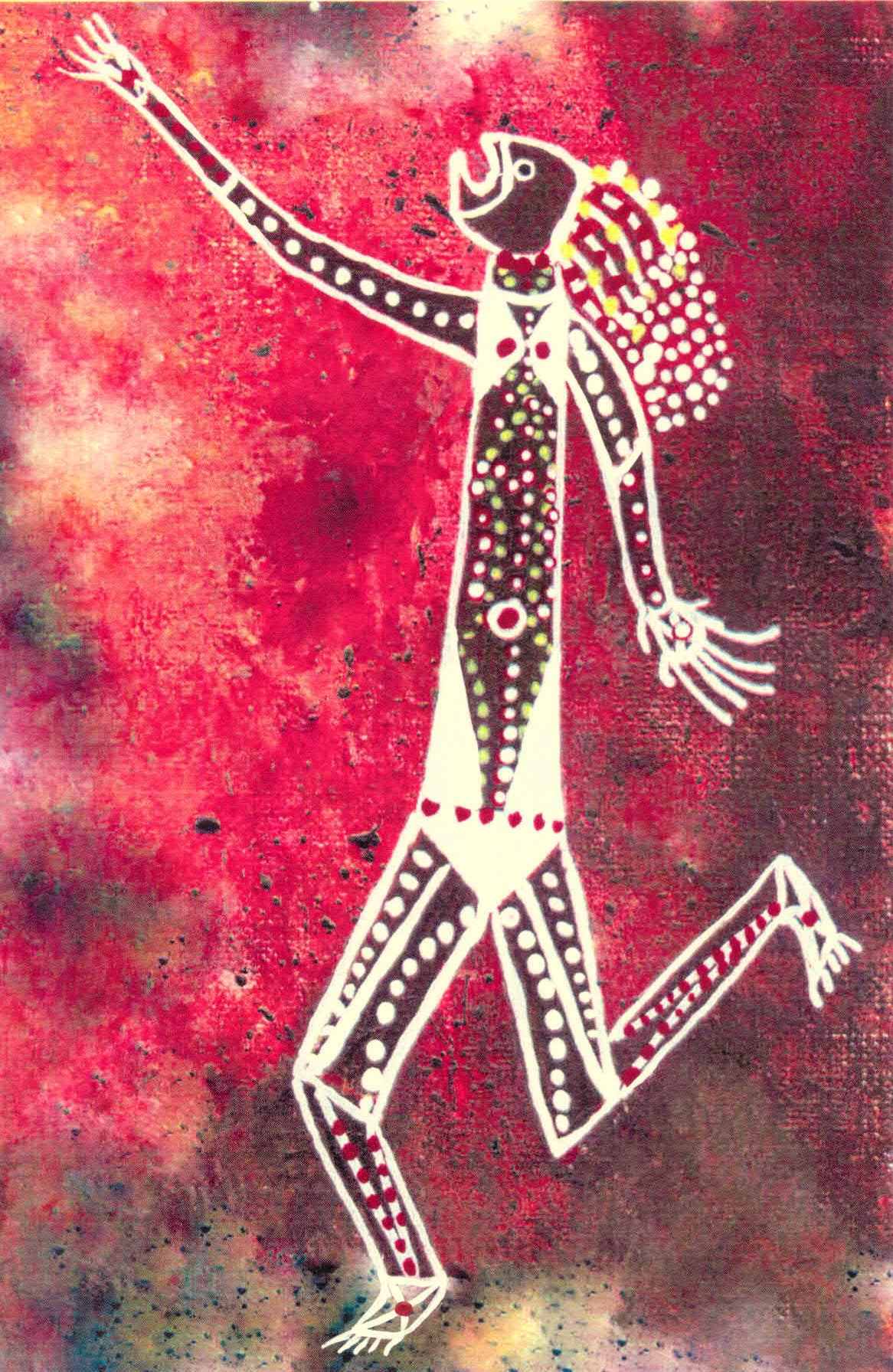 In the early days of the new milllenium, the spirit of Australia came to me in a visitation. On the surface it seemed like a dream, but underneath someone from the Dreamland Down Under sent me a message, that I was indigenous in a previous life. In a culture where men's and women's roles are distinct, I was a 12 year old boy, and the Spirit showed me participating in my coming of age ceremony. With the other hunters from my tribe, we ran through tall grass, beating drums and shouting, chasing an animal with the intention of killing it to feed our families. With the animal cornered, those gathered shouted gratitude to the animal spirit and it was finished. Since I received this message I developed an interest in the Dreaming, where the guiding spirits hold dominion over their earthly counterparts. The pieces in this project reflect my on-going interest and felt connection to the land and the Dreamings.