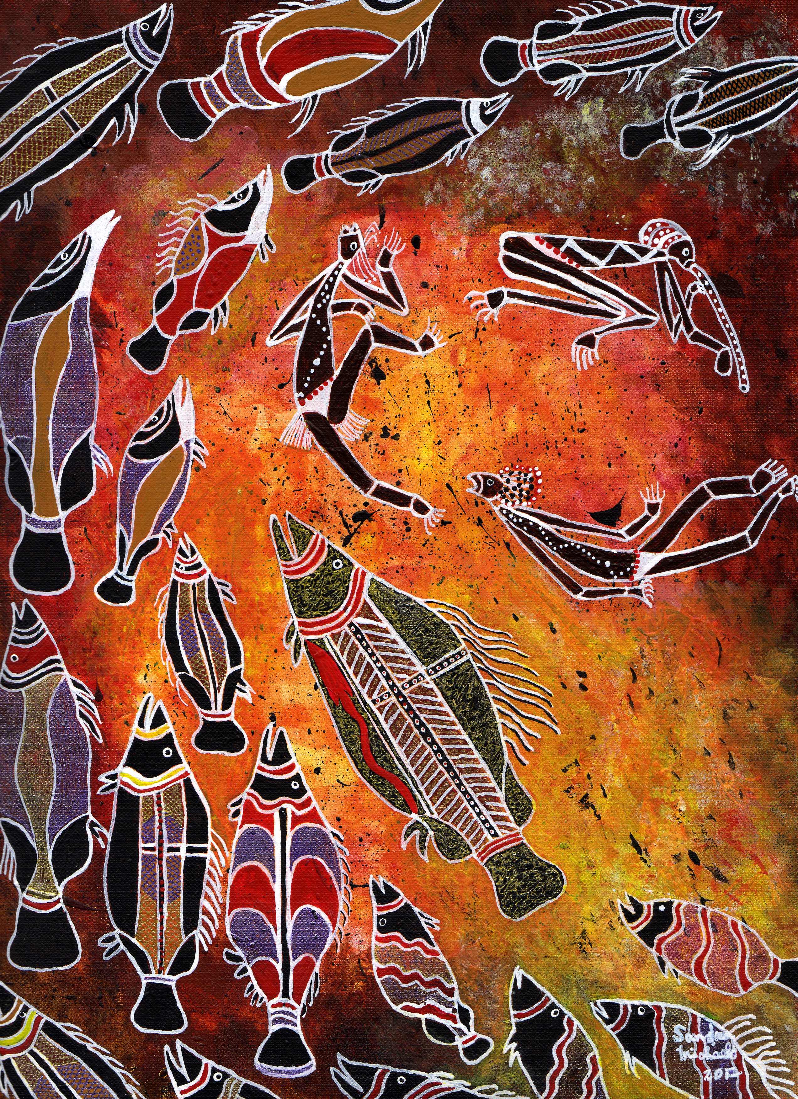Salmon DreamingMedium: acrylic paints. Size: 13" X 10." The creation myth in indigenous Australia is called the Dreamtime. There is a felt sense that the characteristics of plants and animals and the qualities of earth, water, and air are "dreamed" of in the spirit world, and once manifest in the physical world, humans are drawn to create icons and artistic representations of this creation cosmology. In this painting, salmon are swimming in schools along with their spiritual counterparts, the Mimis. They are spiritual beings who protect and guide the various parts of creation they have been fashioned to serve. -
