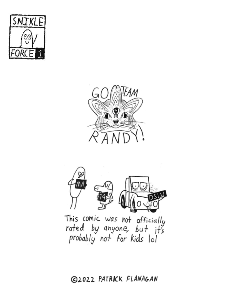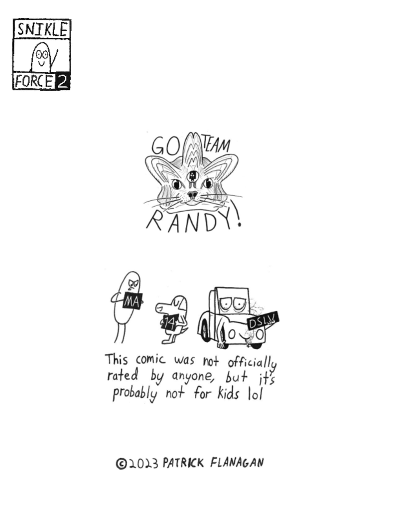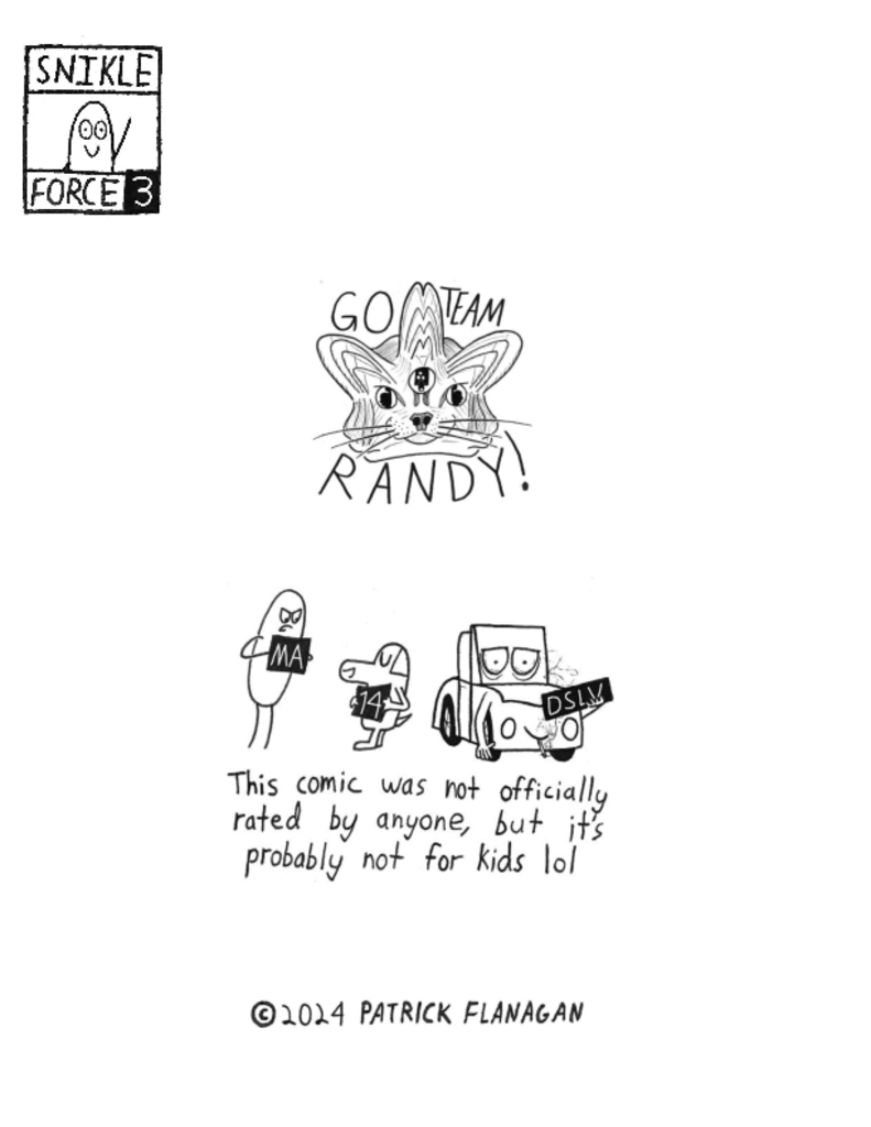 Drawn in 2023-24, the third and final part of the first Snikle Force story, "The Z Goes To Jail." Following their embarrassing livestreamed debacle of a skirmish against domestic terrorists, Snikle must deal with the fact he indirectly led to his co-worker getting killed. Just as Snikle's paranoia boils over, Fred decides to let The Red Z out of his cell, and tricks Snikle into getting locked in instead (as well as himself, accidentally). The Red Z flies to The Hague to argue his case with a complicated fabrication, only to find that they never wanted anything to do with him to begin with. After returning a free man, he lets the rest of The Snikle Force out of the cell just to rub in how Snikle had treated him over the grant money. Conveniently, he also reached a settlement with the dead co-worker's estate for that exact amount, for no reason than to rub in further that he won the 3-way leadership pissing contest.