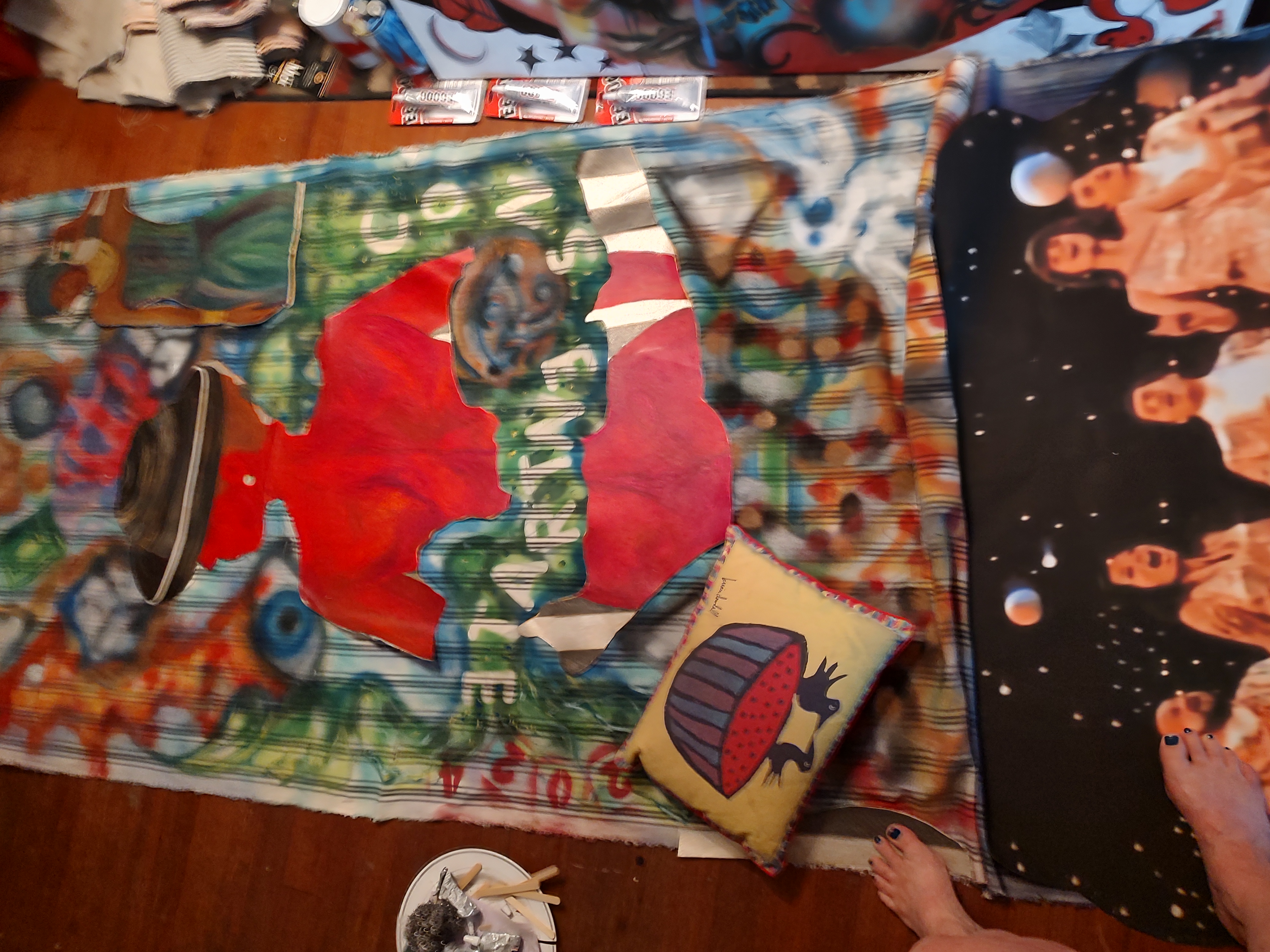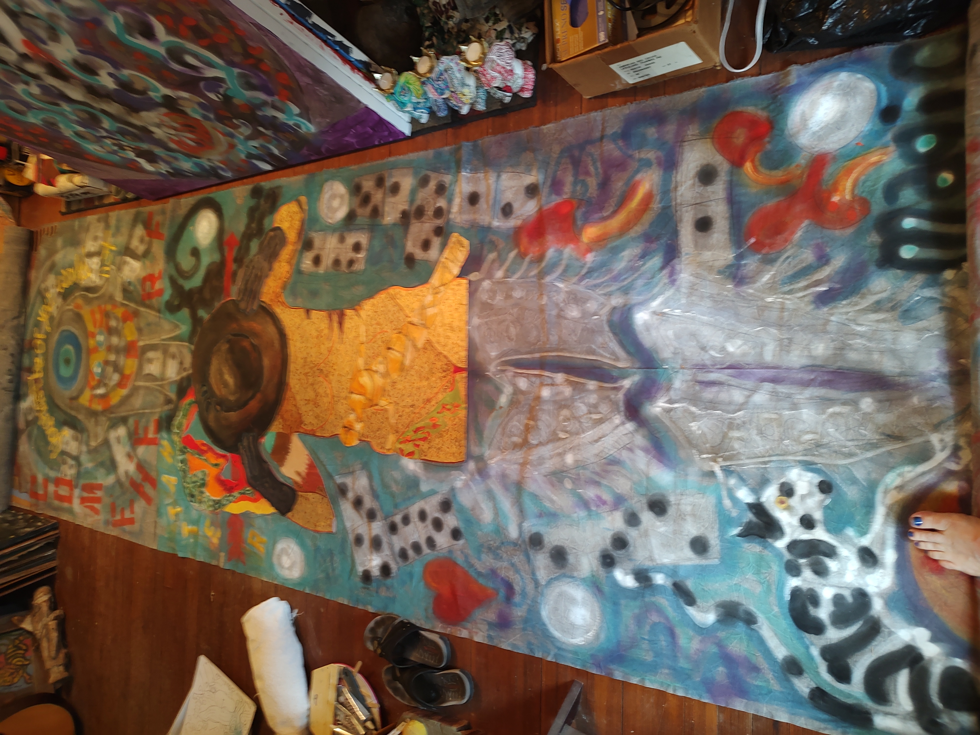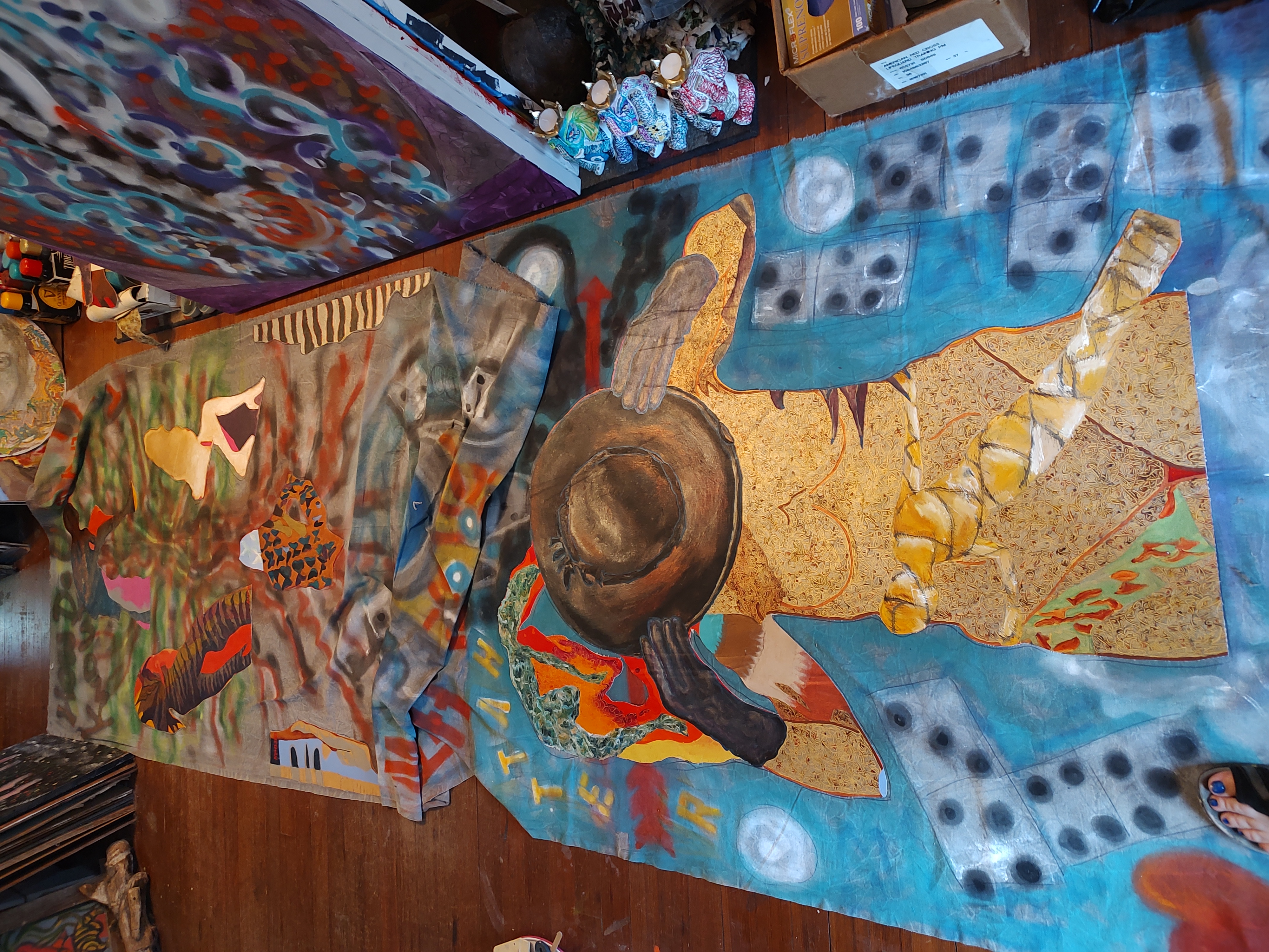 Dream Scape Room of 2020, on Pop’s vintage drafting table, a small 5’x7’ alcove upstairs room, with an outside door that leads to nowhere …this I believed to be a portal for the spirits. I had conjured folks and artists, séance style most of 2020 production, while in total Isolation. For this Production, I drafted in a simple sketch book and collected images, whilst pouring over the vast library here, channeling specific artists, inspirations from the great beyond: MARISOL, Basquiat, Kahlo, Haitian Art, VooDoo, Clemente, Picasso, Banksy (still with us), Van Gogh, Mexican, Brancusi, Turner, Nikki de Saint Phalle, etc. The Sails were in Realtime, Right to Left, Spray Paint Graffiti approach first layer, as the catalyst within storyline, Next, I refer to the Acrylic Layer, as “Skeleton Tango”, (day-o-dead homage), select pallet to celebrate the black & white cultural blend, with a Final Layer of OILS, representing the spirit world ‘Astral Plane” flowing in and around each Sail/Canvas. In direct contrast to last year’s production …this work is: Joyous, Beautiful, Mysterious, Autonomous, Poetry, … a Soothsayer reflecting to me, like a Magic Mirror, recording Our Story …