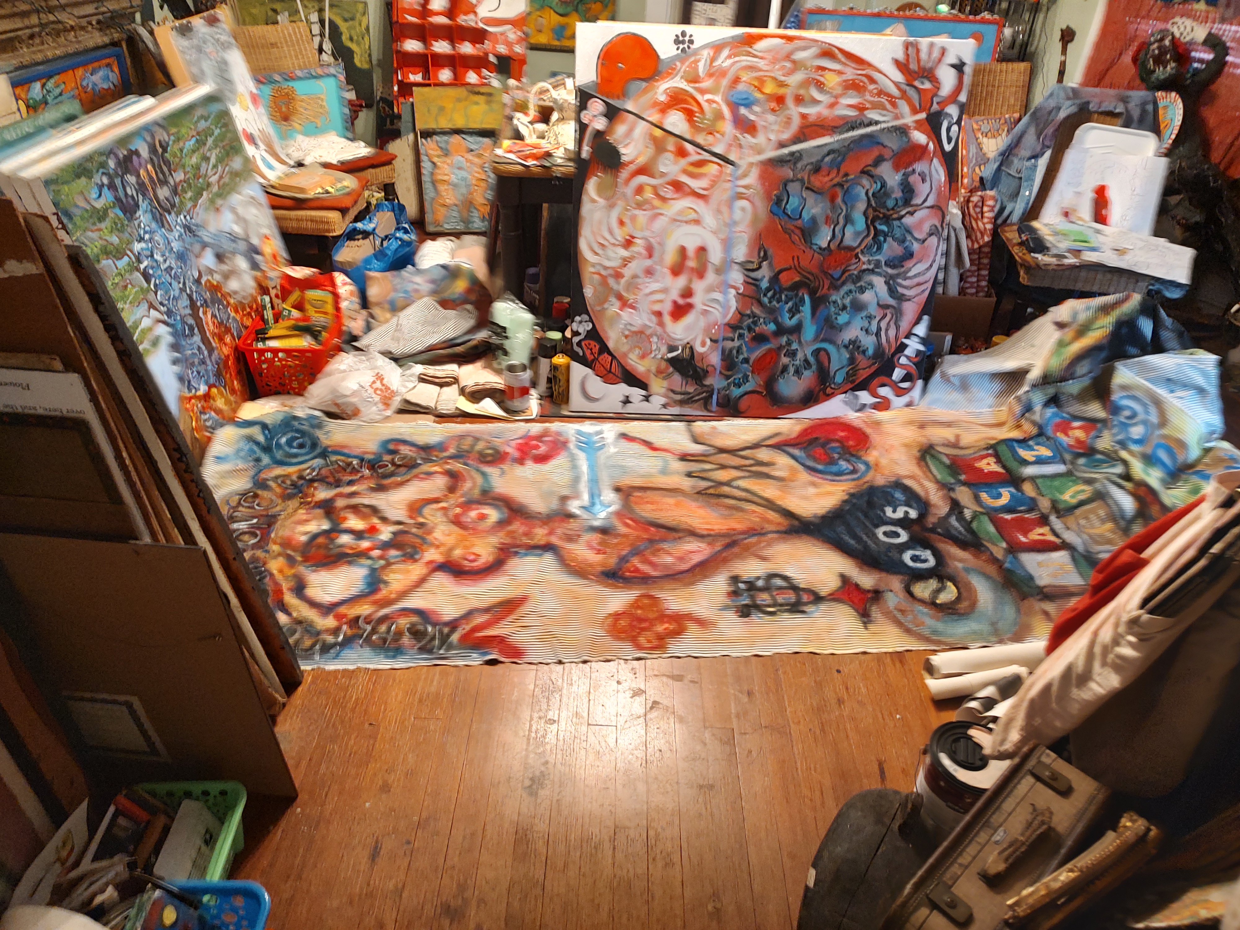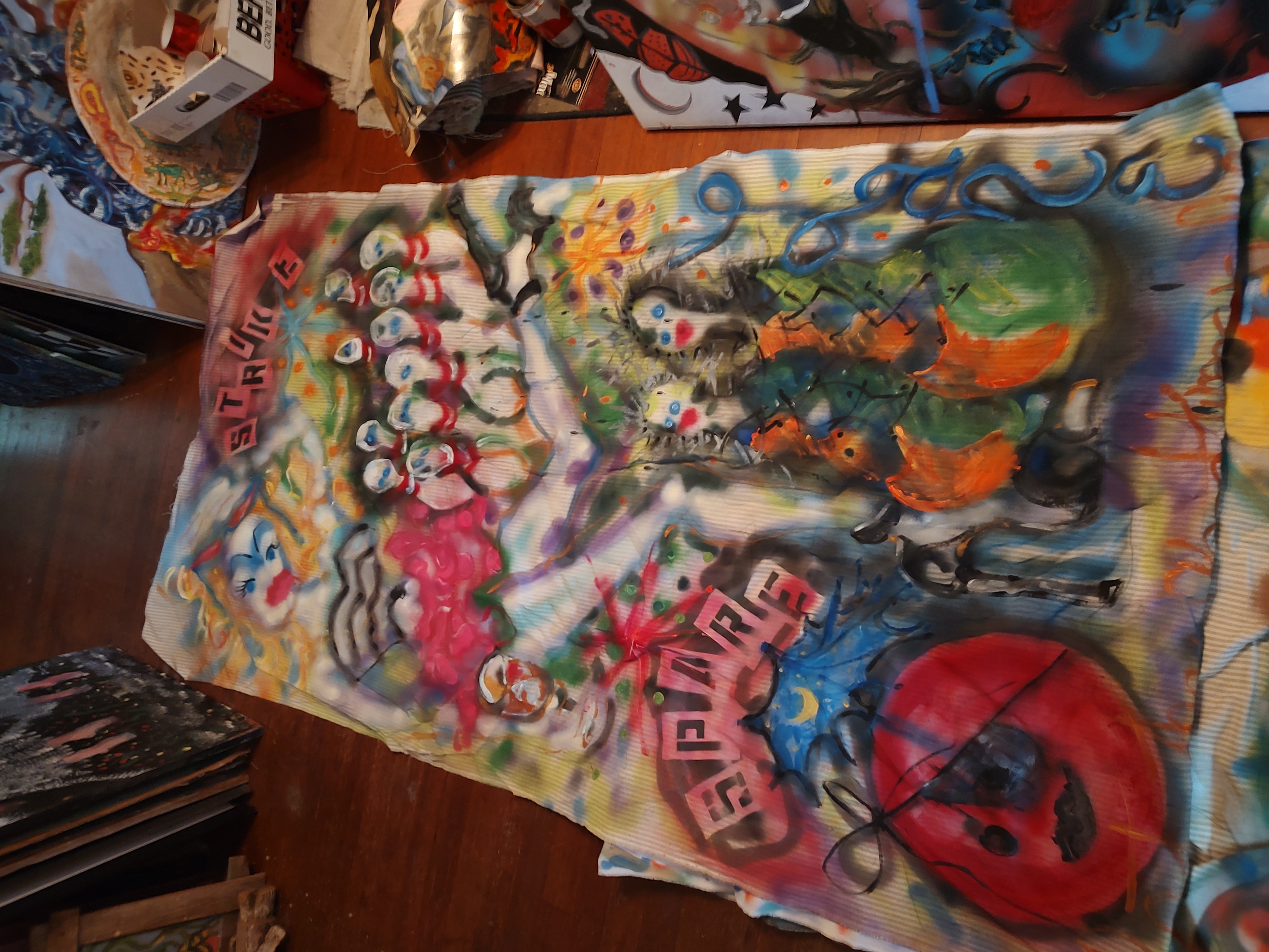OF: 3 VeryLarge Spirit (series) paintings & significant 6 HATS NXS (series), of my collective major retrospect of work; that were finally relocated to Art Park Project 2018, just prior to the loss of visionary Brian Dowdall. These pieces were water damaged, 2022, in the basement collection holdings (I guess thankfully only my work). It was recommended (amazing Ted, of the Sideshow), “refashion them”, and they are being recycled like most everything of Art Park Project. Once Upon a Time, as I moved forward with a notion of “upcycle”; a staged exhibit, springboard from “Open Studios” was in play; then as fate would have it, in the worst betrayal thus far, someone stole “the KISS”, post the actual painting being stolen.