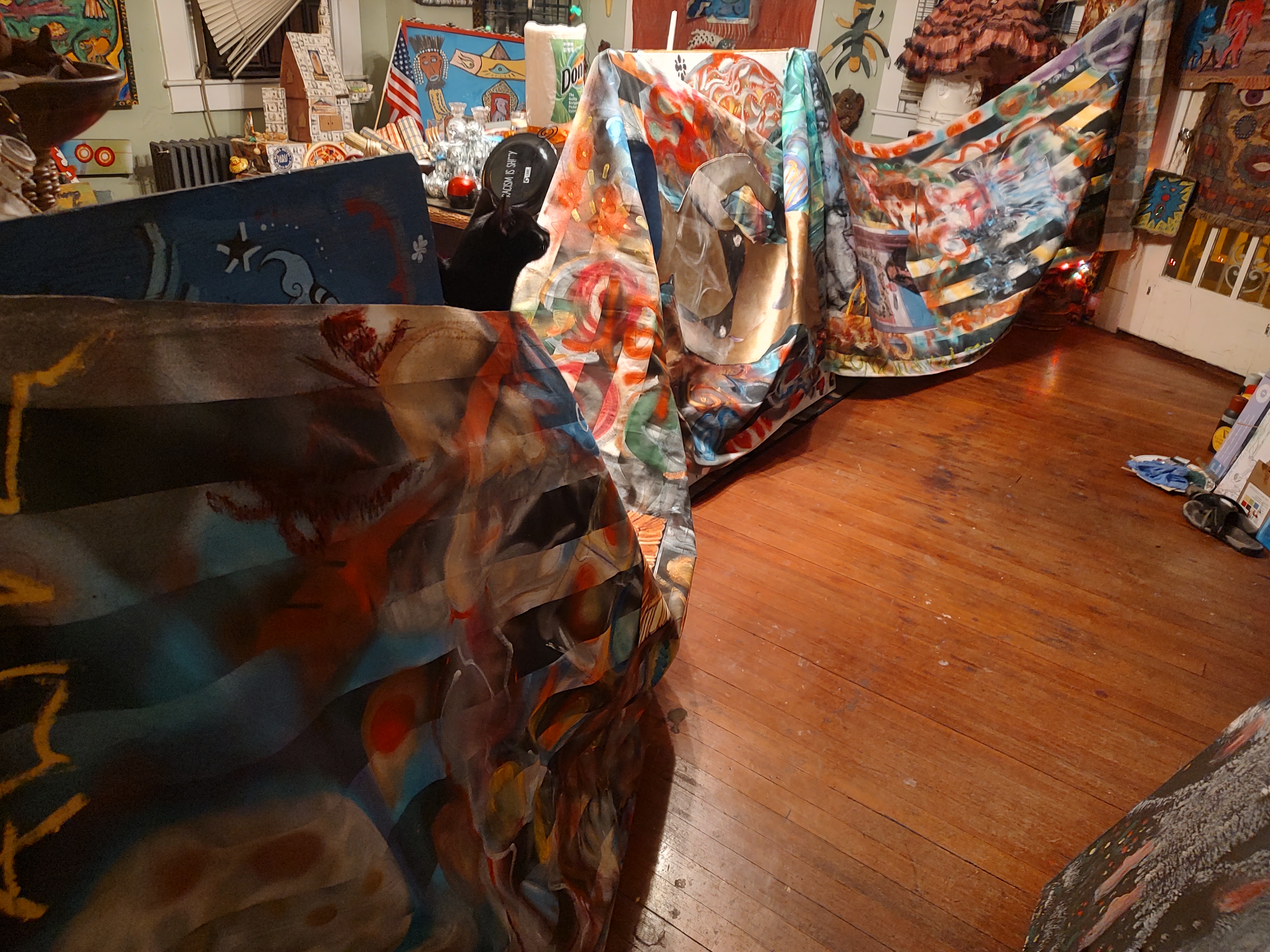 The experimental, outsider work, incorporates the intended (at that time) installation; committing to long panels of cotton duck, with selected preprinted patterns, to be the backdrop of vintage (international Italy world art website); the traumas in collusion with the high bar (my personal 3 select VeryLarge Spirit “keepers” & 6 HATS NXS) set the stage for an overwhelming …studio production 2022-2024-. The media layering would not be considered archival, just as the actual cutting these paintings off the molded stretches and cutting them out as if actual “paper dolls”, ironically the name of an earlier series …what you won’t do for love, passion, my best friend is “ART” since I was three.