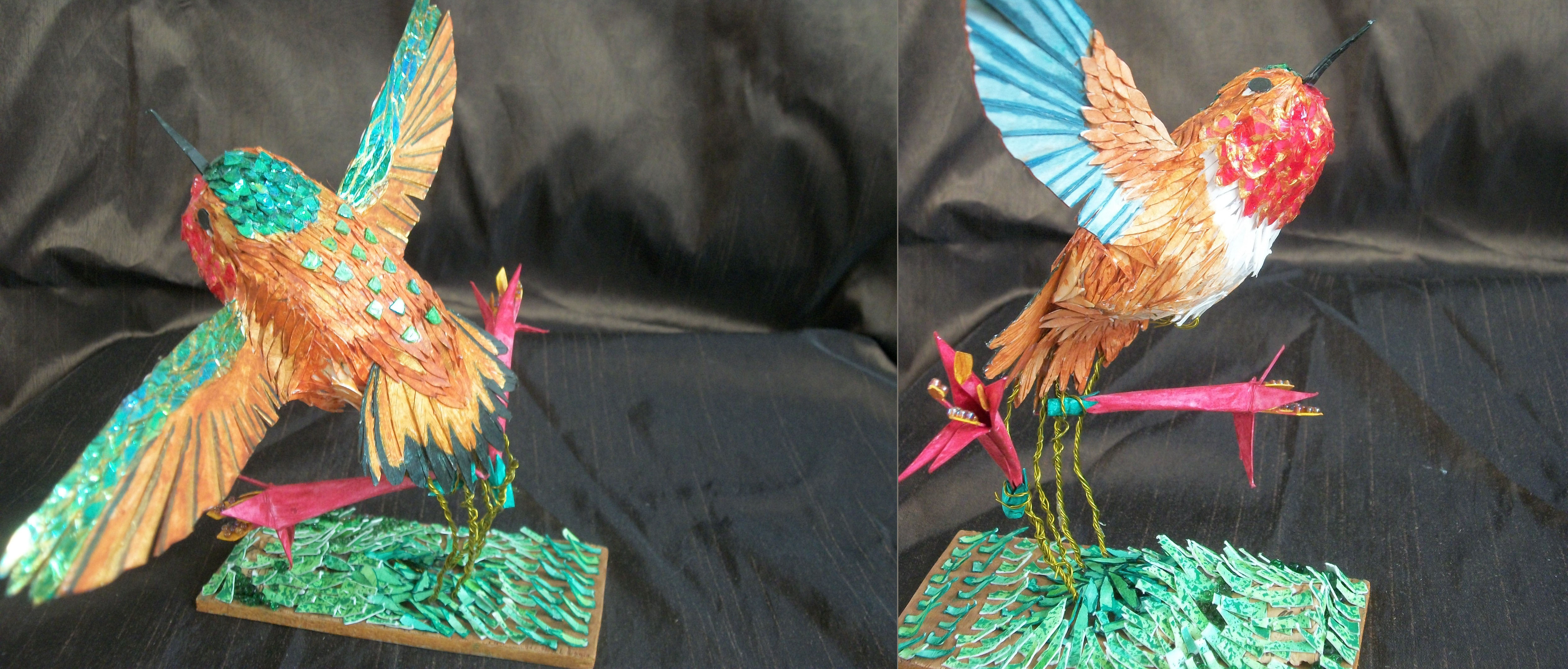 Rufous HummingbirdMedia: Cellophane, Paper, Watercolor, Wood, Wire/ Summary: The 3 inch Rufous Hummingbird is on my wish list of animals to observe in the wild. This small bird migrates from Alaska to Mexico with a wingbeat frequency of 52-62 beats per second. -