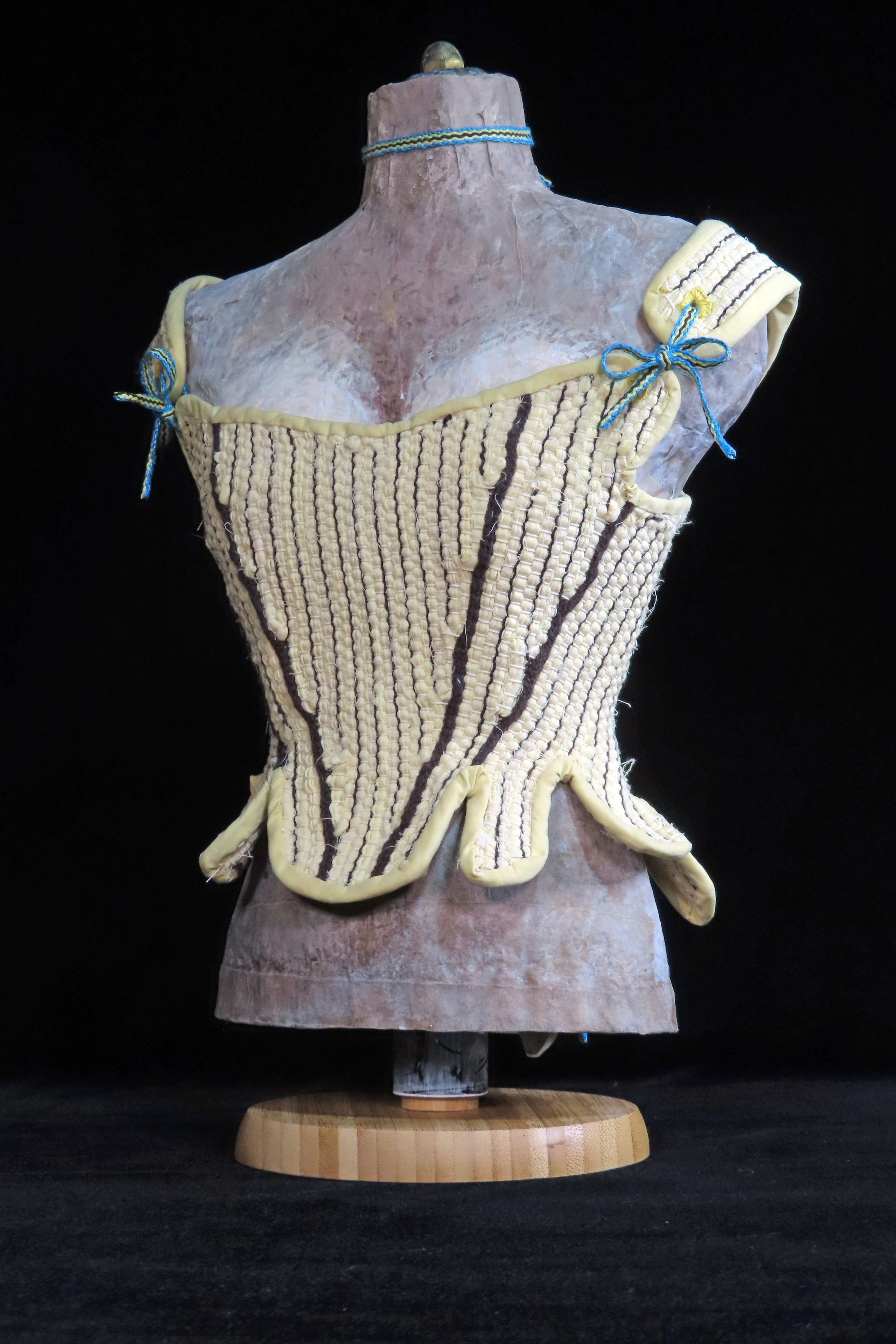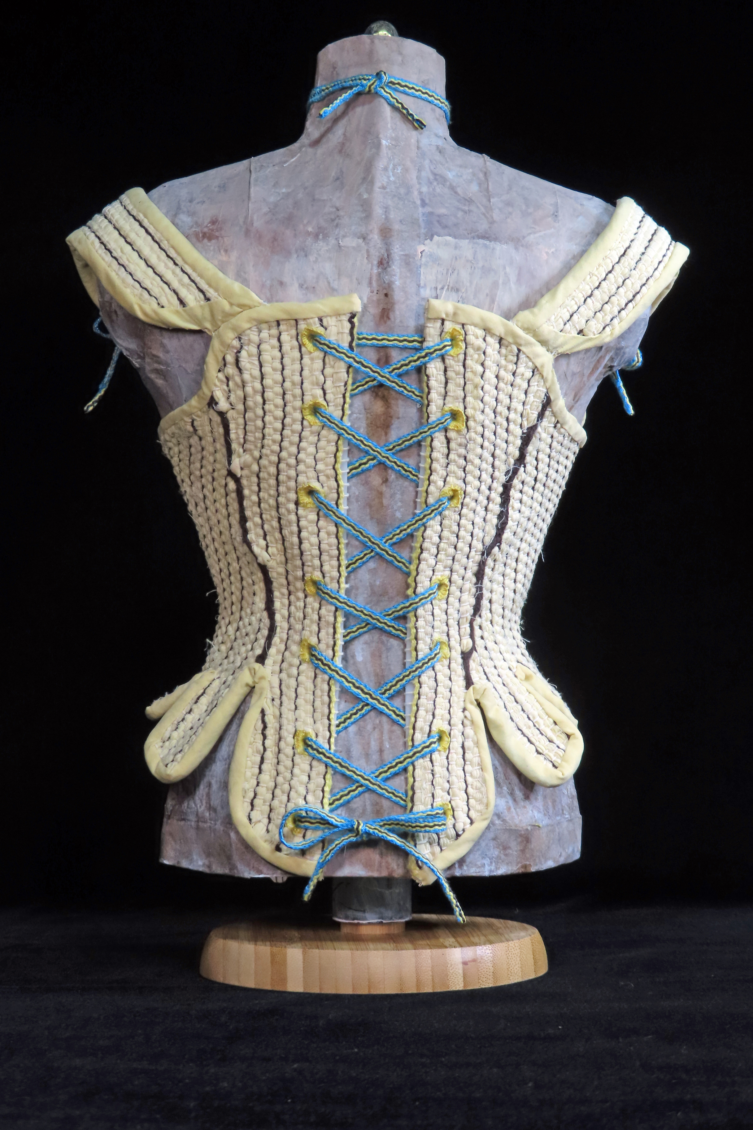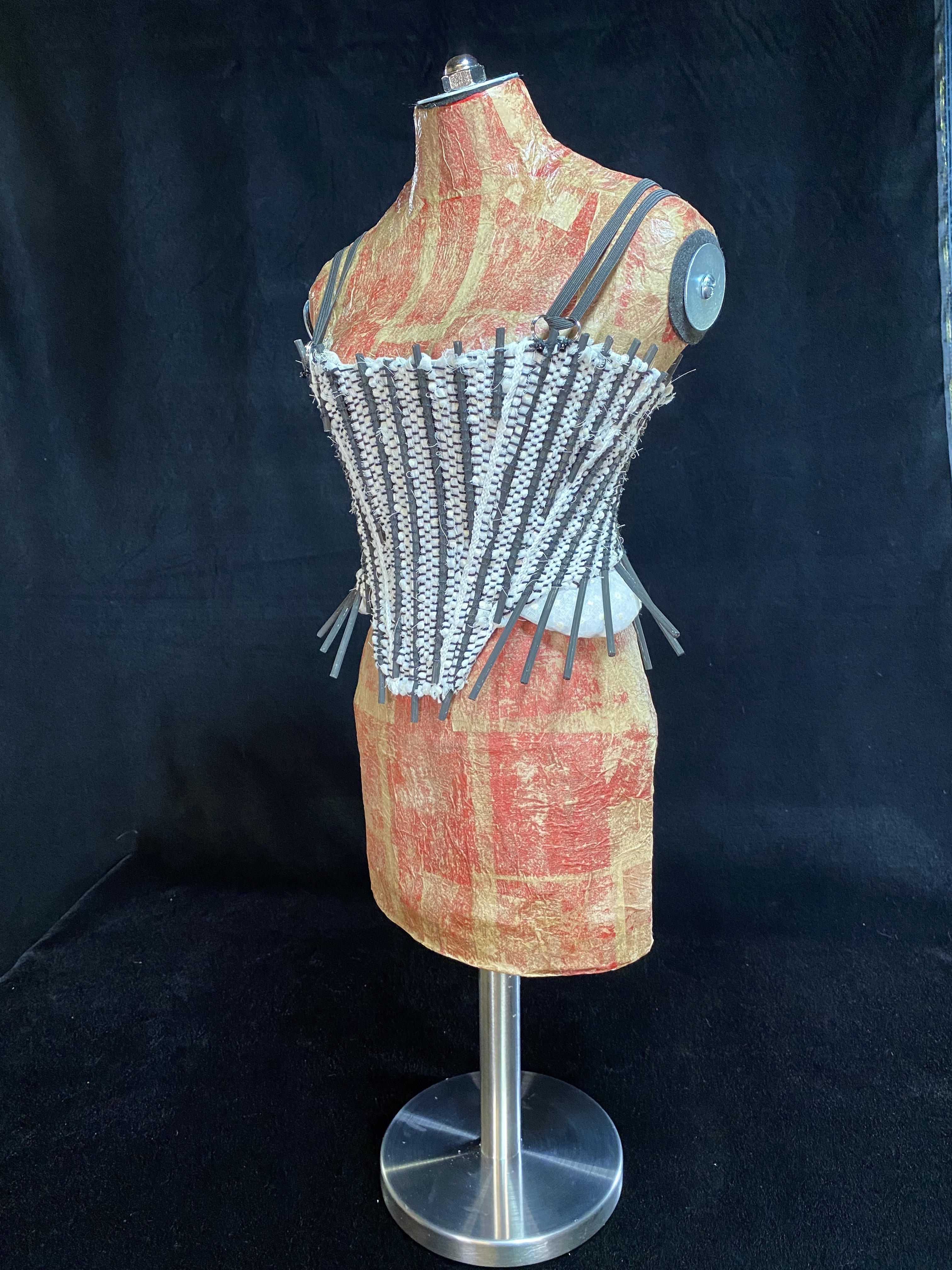 Pulled Warp CorsetThis pulled-warp corset is a miniature fantasy bodice for an escape to a storybook world. This half-scale garment is woven flat on a floor loom using cotton rags and yarn in plain weave. The corset is shaped off the loom by a pulled-warp technique. The lacing is an inkle band in cotton and Tencel. Maybe this is what Cinderella would have made for herself from left-over fabric scraps. Making costumes and playing dress up allows the imagination free rein. (2021)