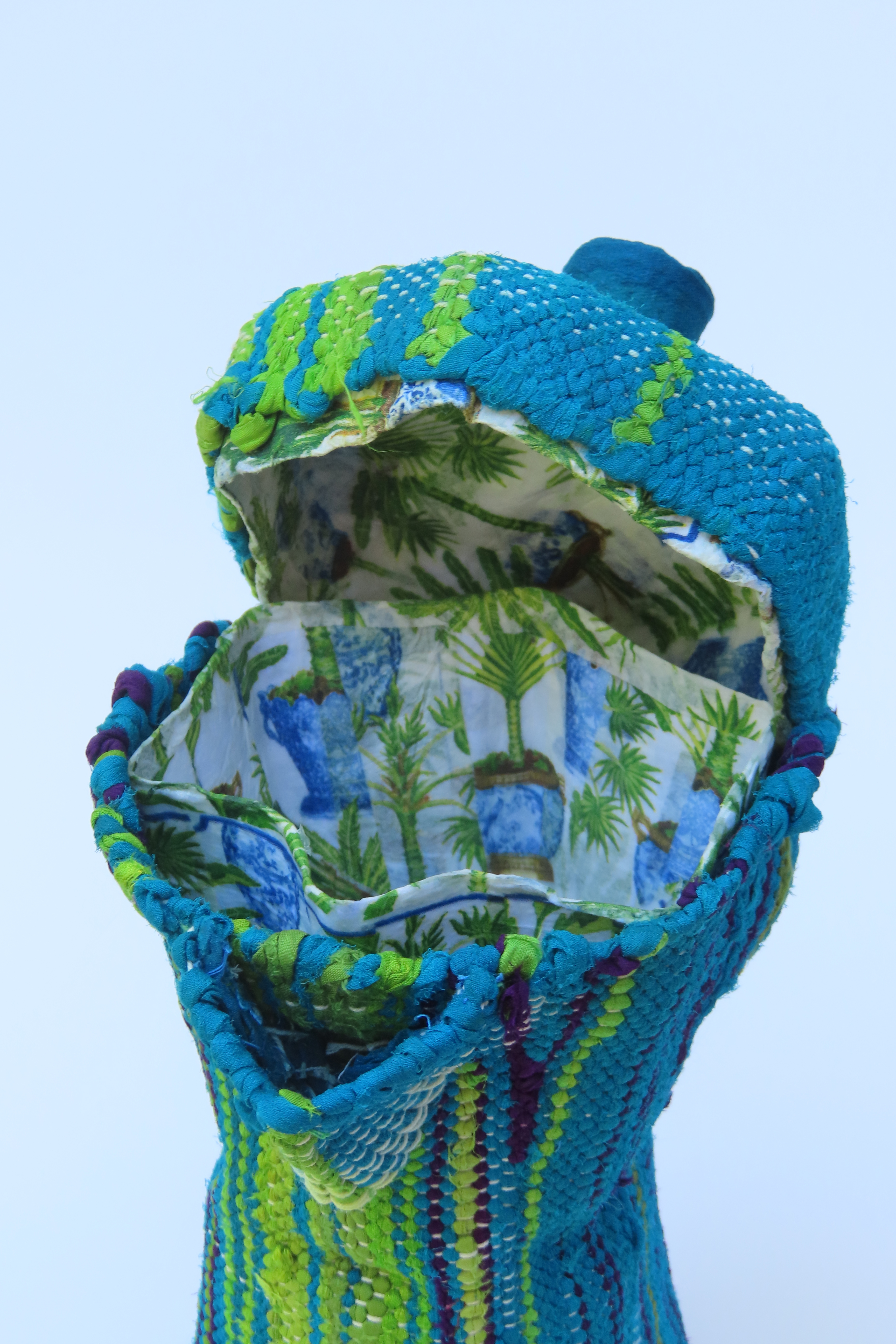 Cuban Coffee Pot detailDetail with open lid. Loom-woven pulled warp, cotton seine twine and silk rags, papier mâché armature. 9.5” x 7” x 5”.