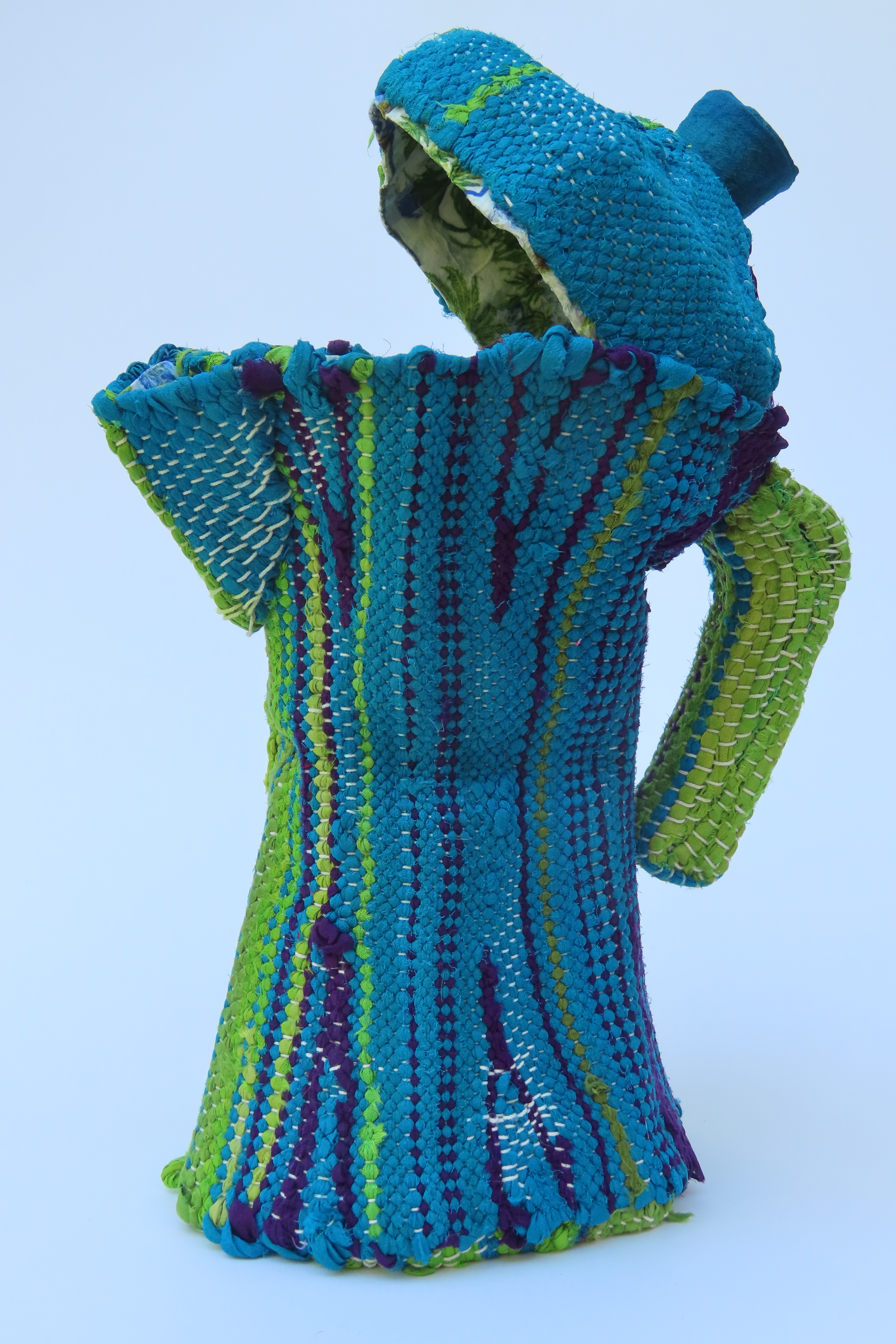 Cuban Coffee PotLoom-woven pulled warp, cotton seine twine and silk rags, papier mâché armature. 9.5” x 7” x 5”. -