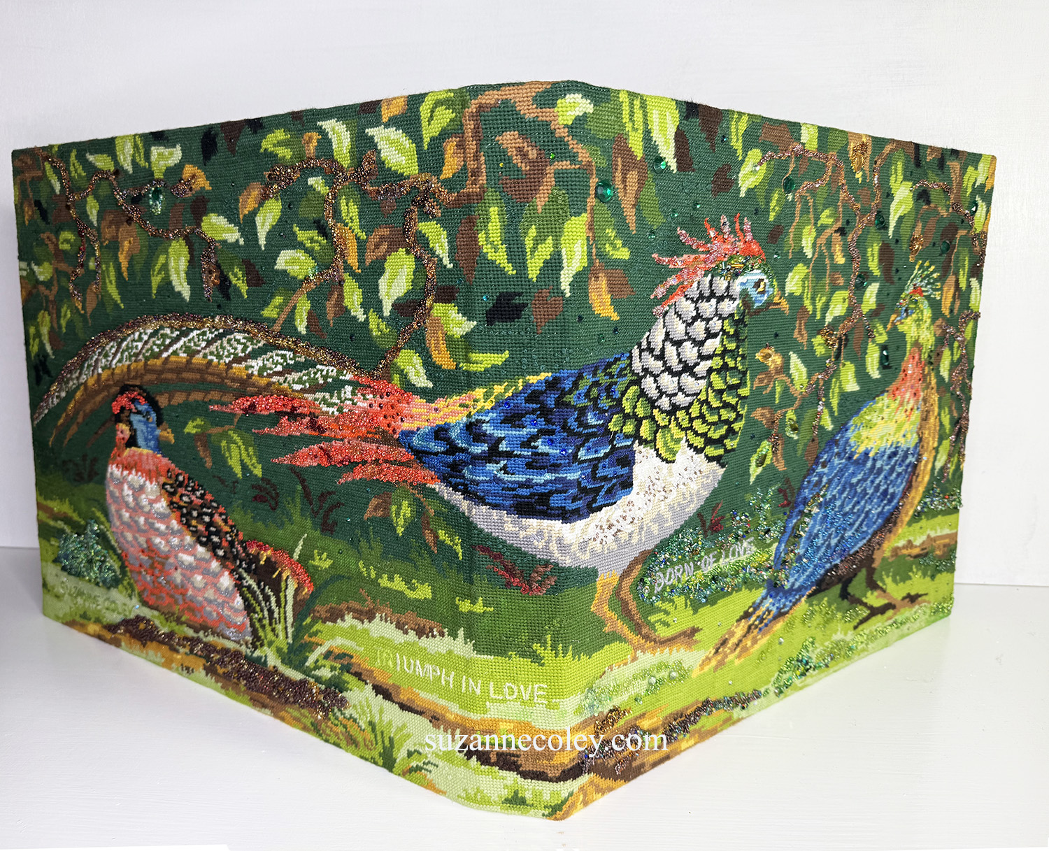 Through color, shapes, textures, and visual movement of materials and design, Born of Love takes us on an emotional journey, line by line, through the poem. The cover includes three vibrant African Peafowls meticulously embroidered on a vintage French double mesh canvas. As a threatened species, the African Peafowl emphasizes how vulnerable we, and the world around us are to the more destructive aspects of love.