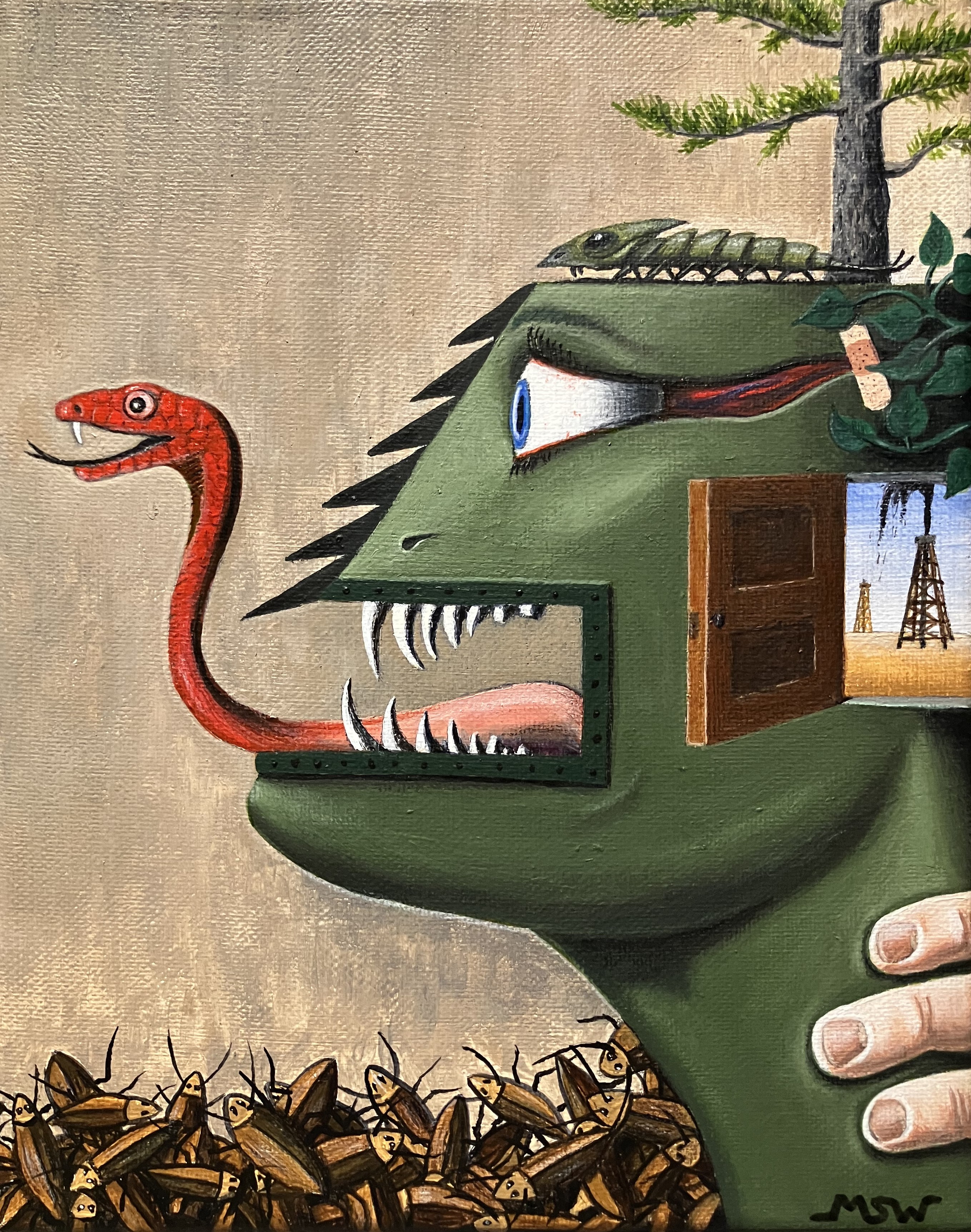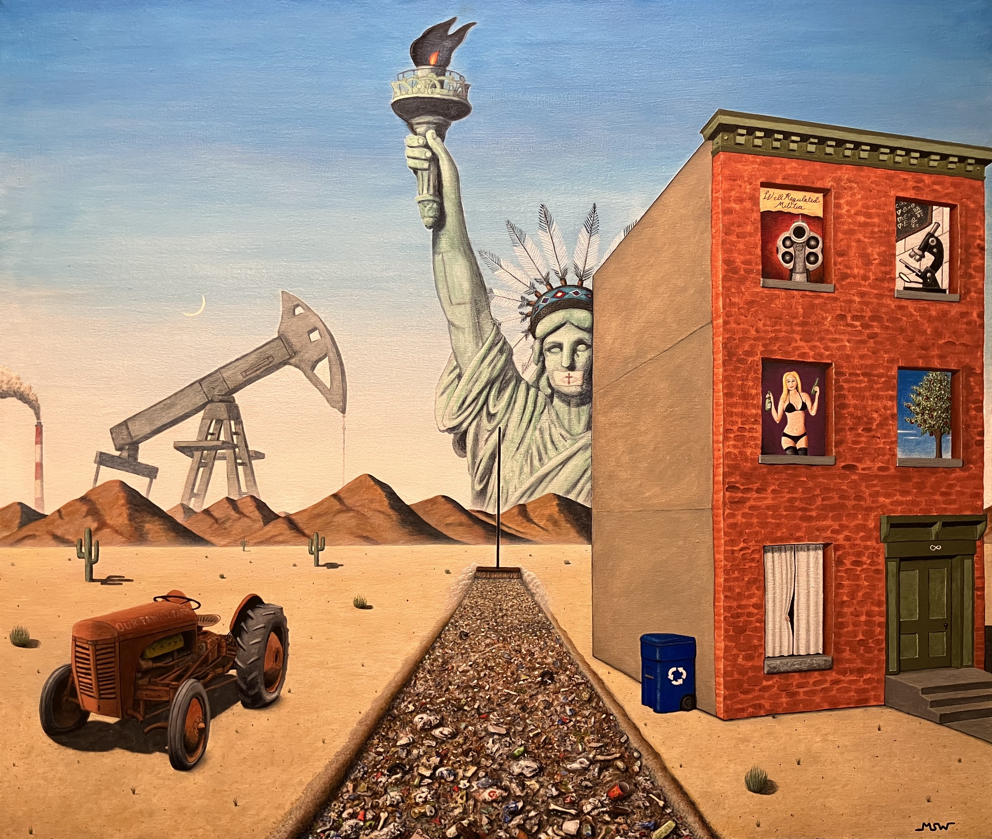 Michael Stevens Wiggs is a Baltimore-based artist whose work delves into the profound interplay between humanity and the natural world. His recent series confronts the pressing issue of environmental devastation and the seemingly insurmountable challenge of instigating significant global change. These works invite viewers to examine the consequences of their consumer choices and ponder the balance between wasteful materialism and ecological preservation.