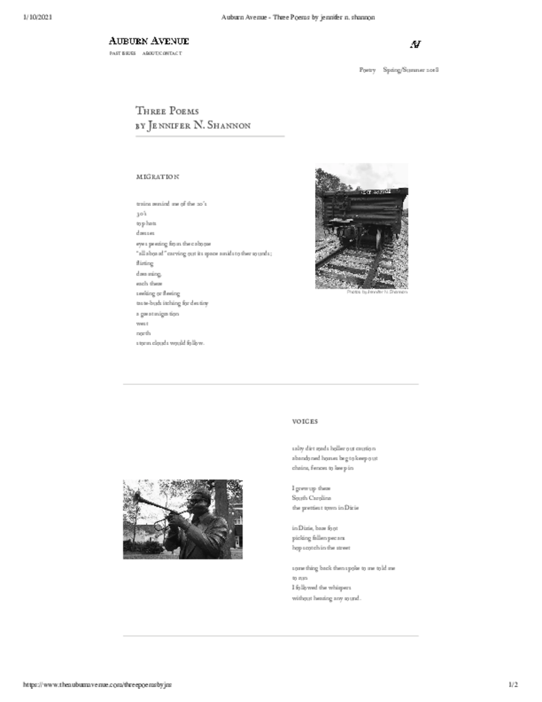 MigrationThis photograph was taken in my hometown of Cheraw, S.C. and speaks to my fascination with trains. The poem that accompanies this image is titled "Migration." Both were published in The Auburn Avenue literary magazine, along with two other poems. https://www.theauburnavenue.com/threepoemsbyjns