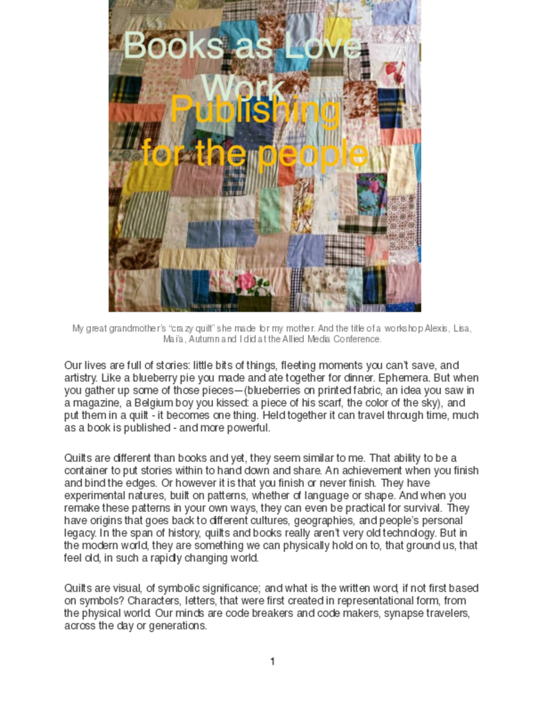 These days, I identify as a writer and a quilter. My great grandmother sewed clothes for three generations of her family and made a quilt of the scraps for my mother when I was an infant. I grew up playing on that quilt on my parent's bed, and hearing stories from the memories. This essay I wrote in 2024 explores how making a quilt is like publishing a book. It is part of a collection of writing I am working on.
