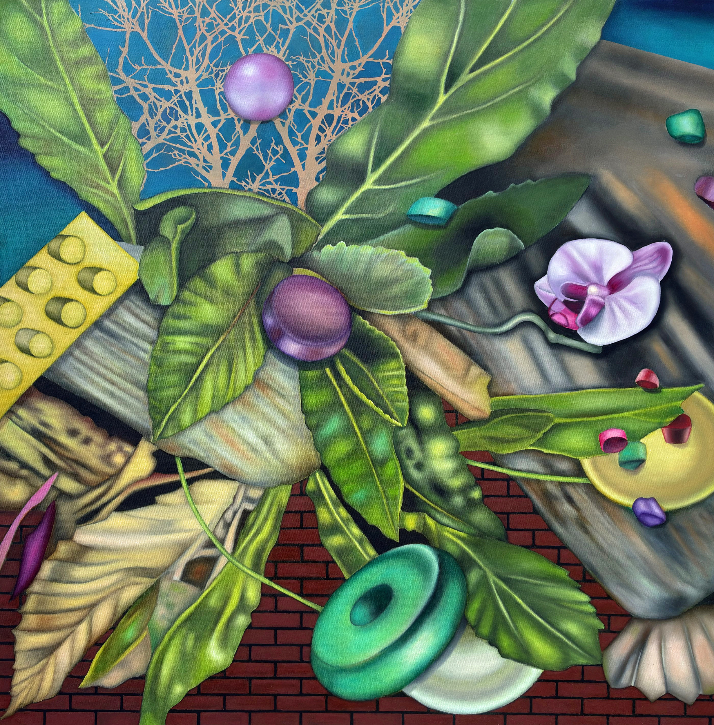 I'm continuing to explore the interplay of opposites such as the use of amorphous, abstract, organic imagery versus the use of delineated, realistic, inorganic imagery. In this series I also work with diverse media (oil, textured spray paint, metallic leaf, pearl pen, enamel paint, marker, colored pencil, and graphite, and diverse techniques such as brush painting, spray painting, stenciling, and drip painting. Although the surface looks like collage, this is simply an illusion, as the surface is entirely painted and nothing is pasted on it. The central idea in this series, of course, is contagion, an idea which occurred, not surprisingly, amidst the insidious spread of the coronavirus. Initially, I focused on the virus and its attendant associations (eg. clorox, masks, vaccinations), but soon I extended my thinking to encompass other sorts of invasive forces such as the spread of bacteria, parasites, insect borne diseases, and the daily inundation of media negativity. I chose to use a very maximal palette in order to emphasize the all-inclusive nature of contagion, a vile force that takes on a life of its own and does not discriminate; it touches everything. I did not want to limit the scope of its reach. It is another element in the panoply of daily life but disrupts routine existence as it lurks in the background ready to pounce.