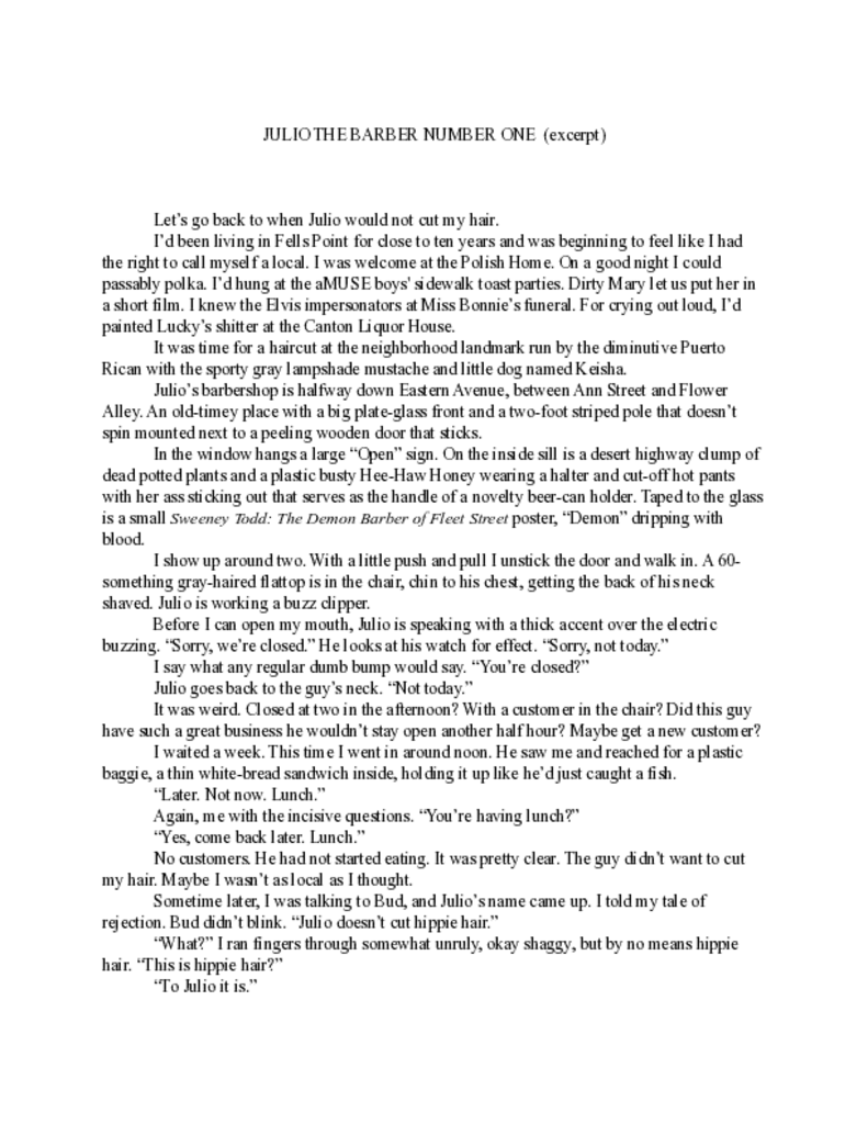 My earliest writing gig was a summer camp talent show. I completed my first novella, The Wolfman, in the fourth grade. Since then I have written three freight carfuls of advertising copy including 3,694 television scripts, 2,314 radio skits, 4 bumper stickers and 107 “buy one get one free” coupons. I won a bunch of silly awards, including the ones from France. I have paid penance for these crimes with two completed novels and a satchel full of short stories and personal essays about my life… more