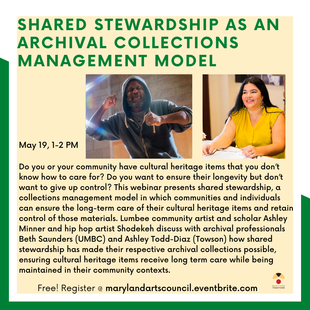 Shared Stewardship As An Archival Collections Management Model, a presentation & discussion featuring living archivists Shodekeh Talifero & Ashley Minner with Maryland Traditions of the Maryland State Arts Council, 2021."Do you or your community have cultural heritage items that you don’t know how to care for? Do you want to ensure their longevity but don’t want to give up control? This webinar presents shared stewardship, a collections management model in which communities and individuals can ensure the long-term care of their cultural heritage items and retain control of those materials. Lumbee community artist and scholar Ashley Minner and Hip Hop artist Shodekeh discuss with archival professionals Beth Saunders (UMBC) and Ashley Todd-Diaz (Towson) how shared stewardship has made their respective archival collections possible, ensuring cultural heritage items receive long term care while being maintained in their community contexts." - Maryland Traditions of the Maryland State Arts Council.