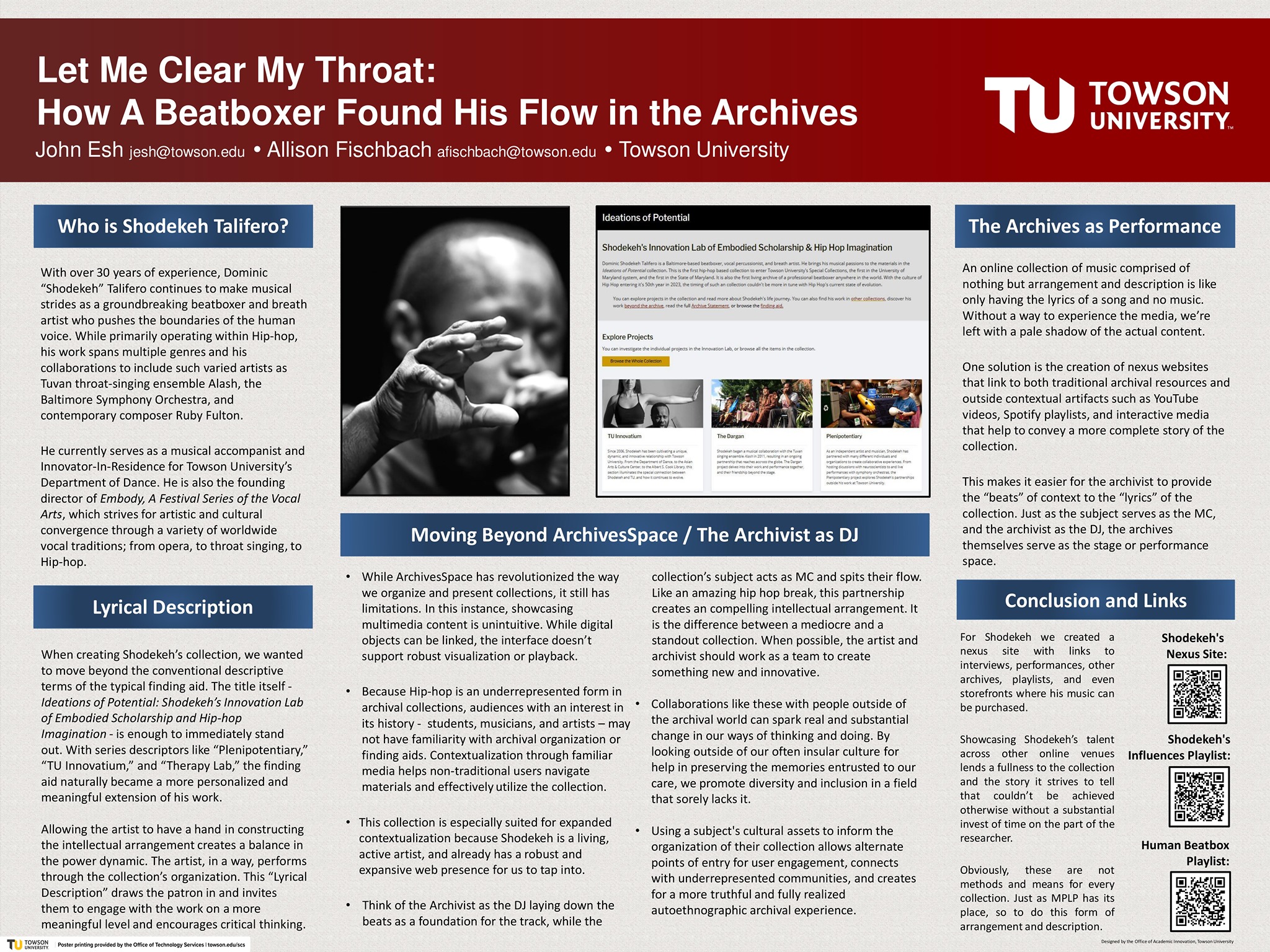 "Let Me Clear My Throat: How A Beatboxer Found His Flow In The Archives" by John Esh & Allison Fischbach for the Mid-Atlantic Regional Archives Conference, 2021."When presented with the opportunity to create a collection for Shodekeh Talifero, a multi-faceted beatboxer and musical scholar, we knew that a traditional finding aid couldn’t properly convey the gravitas of his work. By reimagining naming conventions, organization, and creating a nexus site for his oeuvre, we were able to realize his vision as a cohesive whole. This poster will discuss the issues we identified and the solutions we implemented." - John Esh & Allison Fischbach.