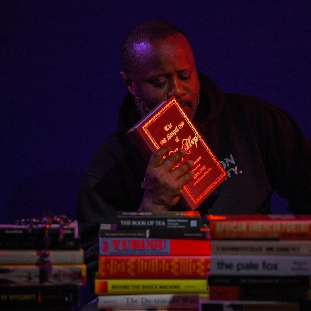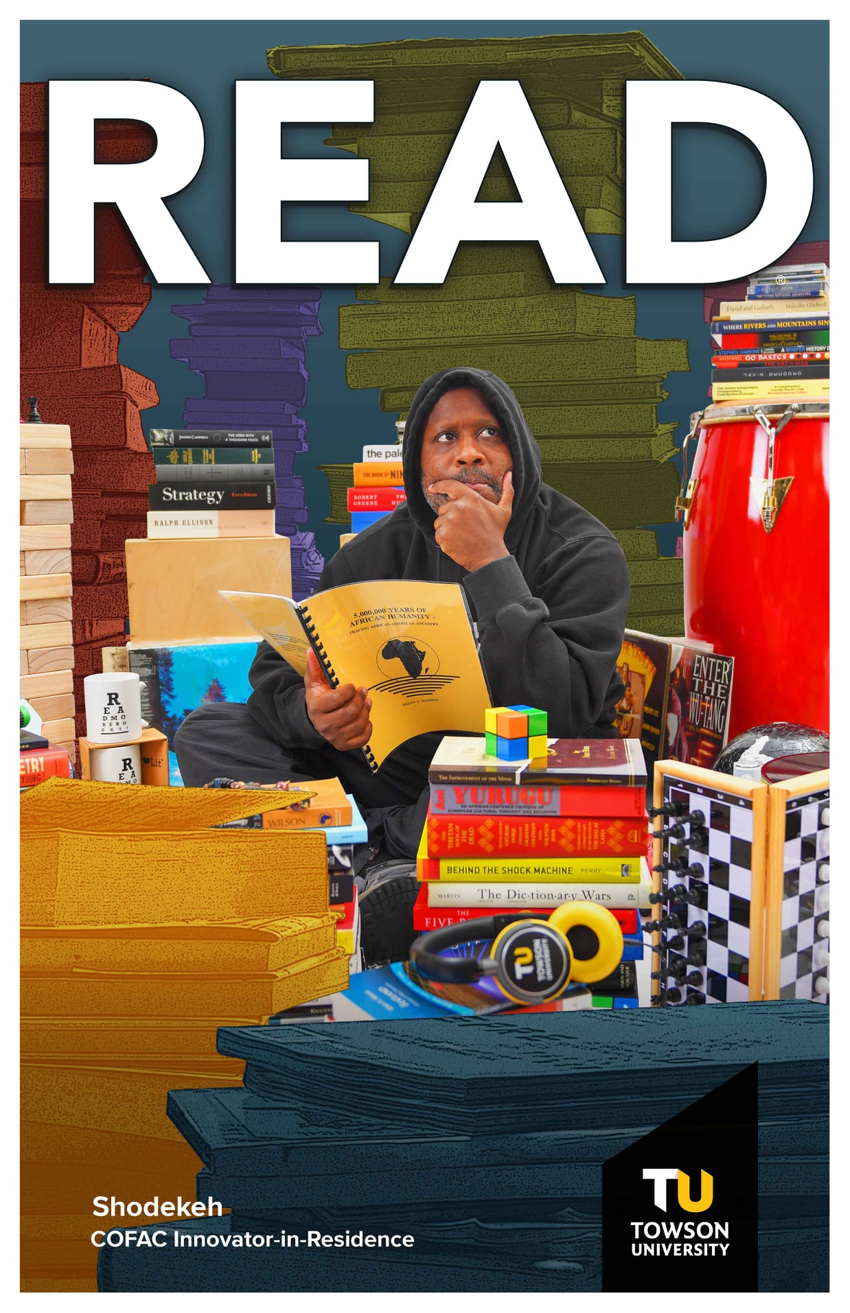 Autodidacticism: Shodekeh's READ Poster, created in collaboration with TU Special Collections of the Towson University Albert S. Cook Library & the American Library Association. Photograph by Alex Wright, 2021."I've always wanted to help create one of these READ posters. If you didn't already know, I have a thing for books & libraries as an autodidact, & a healthy pre-occupation with reading & learning, particularly if a constructive feedback loop can be cultivated between my practice as an artist, researcher & avid collector of literature. I'm so happy about this I can barely contain my curiosity about the universe & all of its mysteries. The journey continues..." - Shodekeh, Innovator-in-Residence of the Towson University College of Fine Arts & Communication.