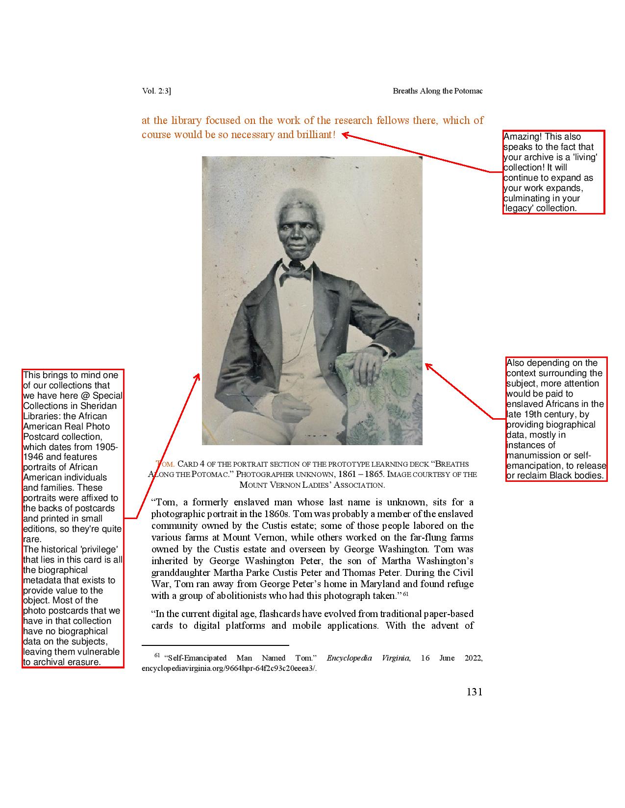- "Slave Memorial Commemoration: Teaching America's Story / 2023 -2024 Research Fellows: Dominic Shodekeh Talifero's "Breaths Along the Potomac," Mount Vernon Ladies Association 2023 Annual Report, pgs. 30 - 33.