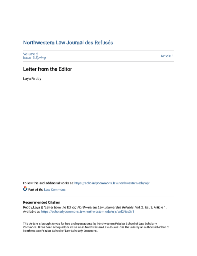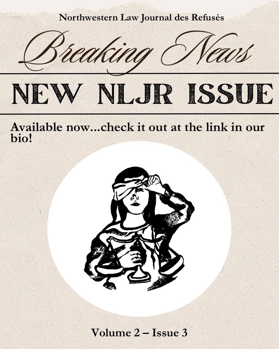 "The Northwestern Law Journal des Refusés (NLJR) is a student-operated journal of law founded on the mission of uplifting nontraditional voices and embracing the legal avant-garde. We publish one print issue of legal scholarship each Spring, as well as online articles throughout the year. We are actively seeking articles that can be meaningfully engaged with by the general public, whether on their face or with the help of practical guidance that will be published in each issue." - The Northwestern Law Journal des Refusés.