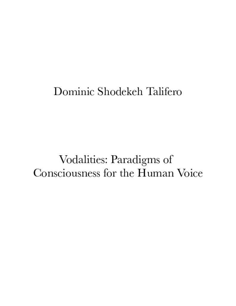 Shodekeh Talifero’s Vodalities: Paradigms of Consciousness for the Human Voice, composed for Sō Percussion. Musical score transcribed by Dr. Adam Sliwinski. Archived at "Ideations of Potential" @ TU Special Collections & the Library of Congress, 2024.
