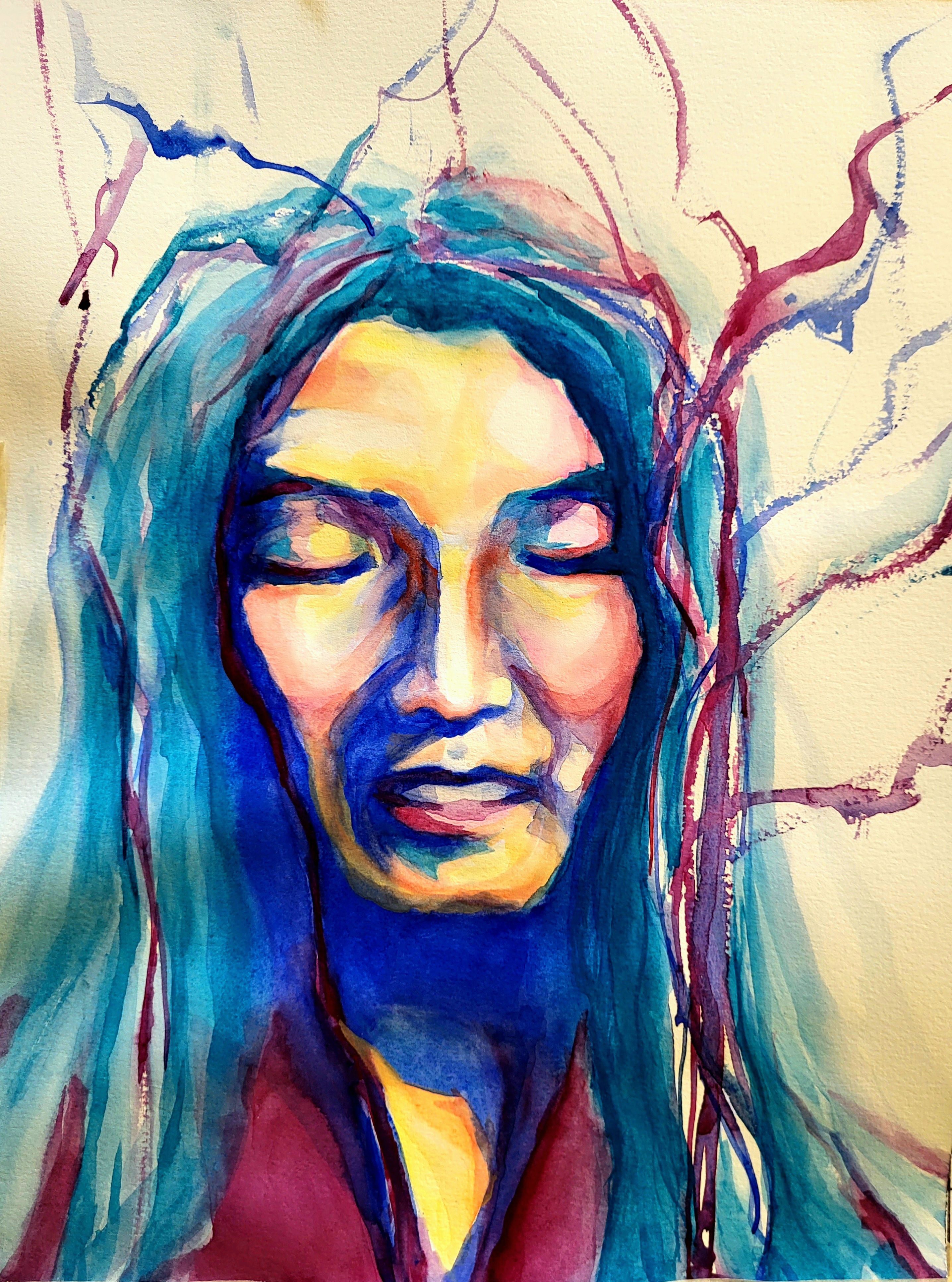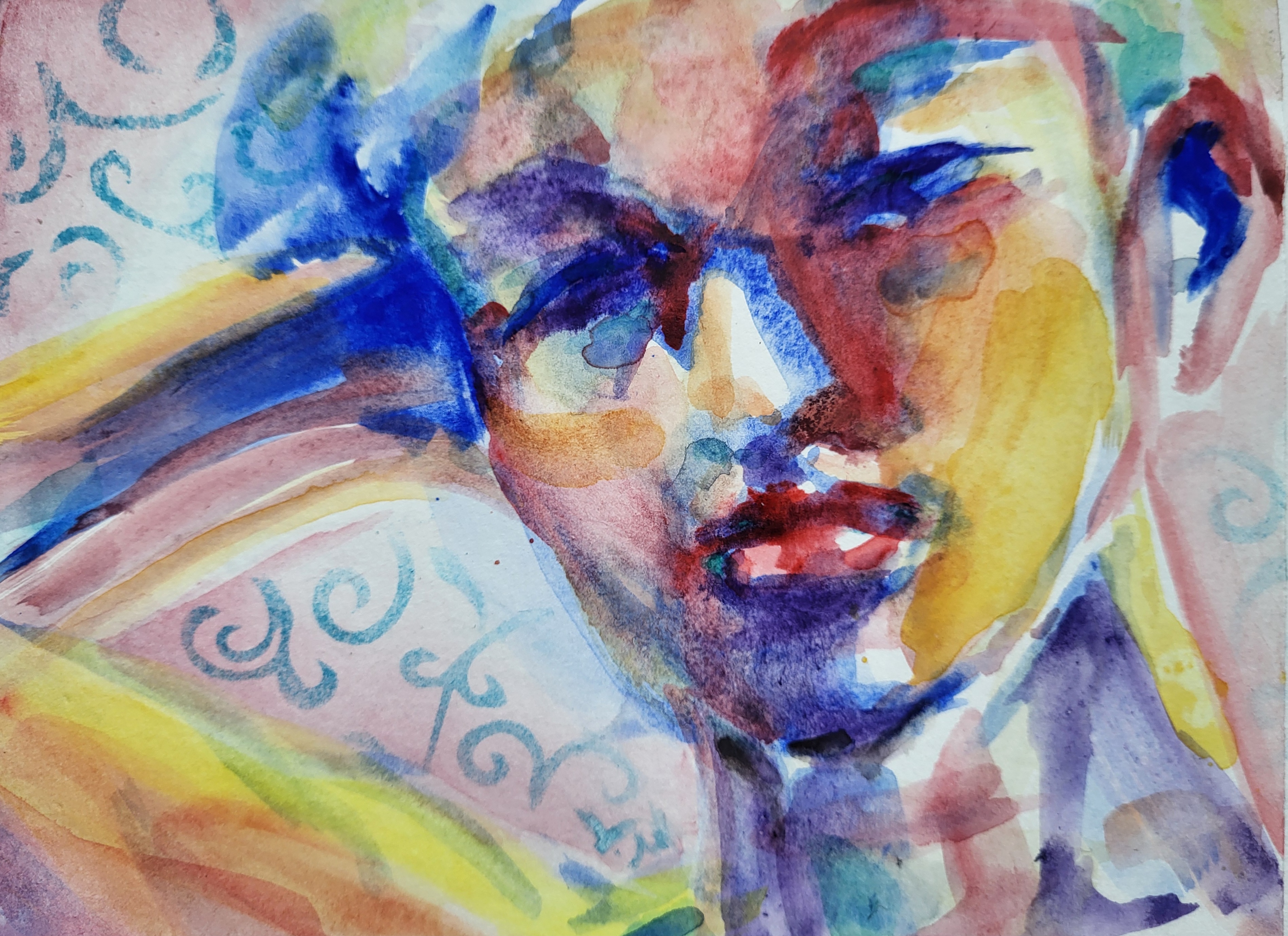 Mini watercolor studies, which are compositional and stylistical experiments with faces, colors and textures; from top left, clockwise - 5"X5", 6"x6", 7"X5", 7"X5", 6'"X4"