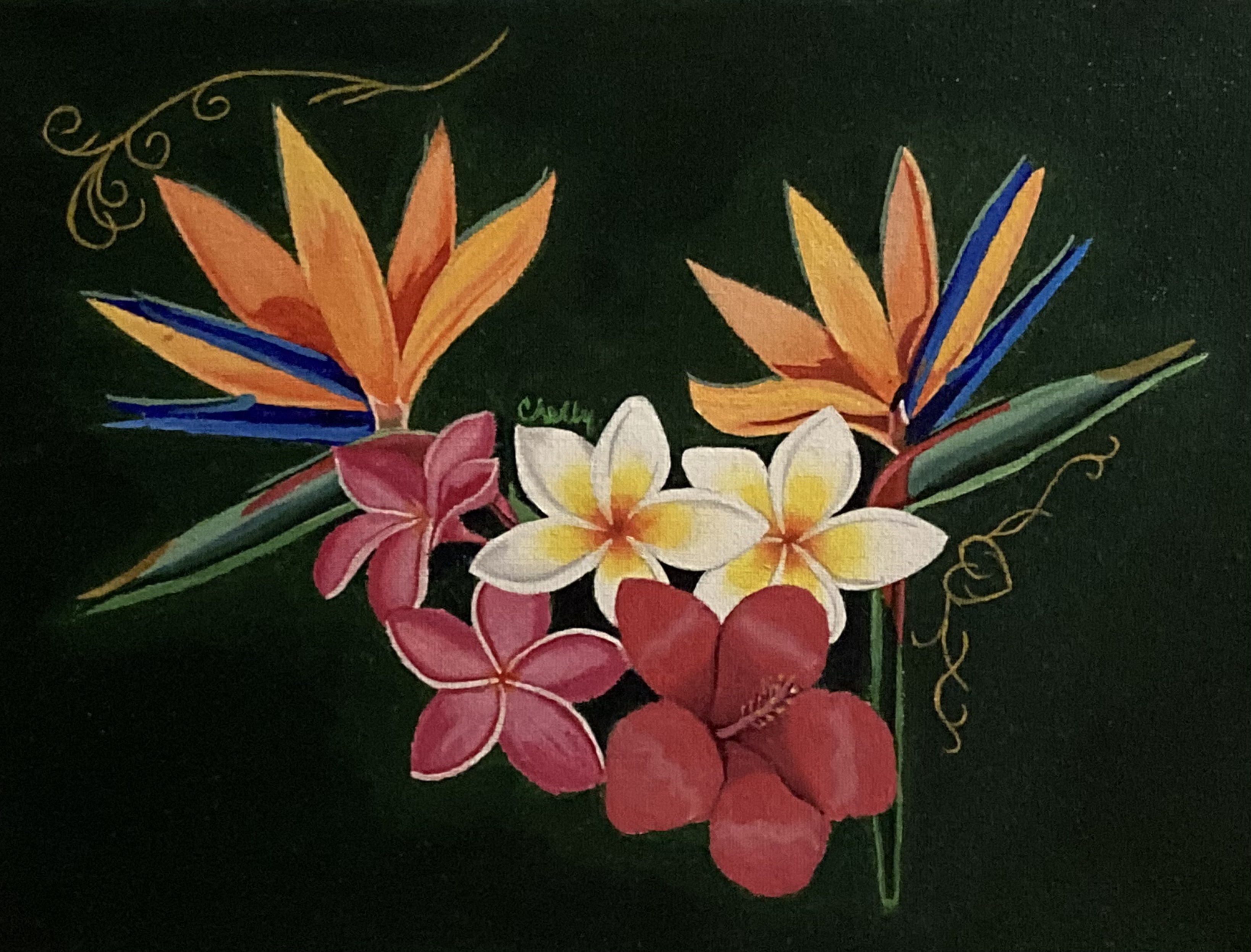 Elegance in Bloom: The Peacocks is a picture of two peacocks, figuratively male (blue) & female (pink), sitting on a tree branch. The blue peacock is facing straight ahead, while the pink peacock is facing the viewer to attract his/or her attention. The peacocks are surrounded by white flowers, in which the flowers are creating a powerful contrast against this vivid, colorful piece. The background of this piece is a great compliment of analogous colors, ranging from yellow-orange to darkest purple, and it is subtle behind to make every object in the painting to stand out.* The white flowers can symbolize purity, innocence, and new beginnings. Which means this piece symbolizes the new beginning of this artist’s continued journey.