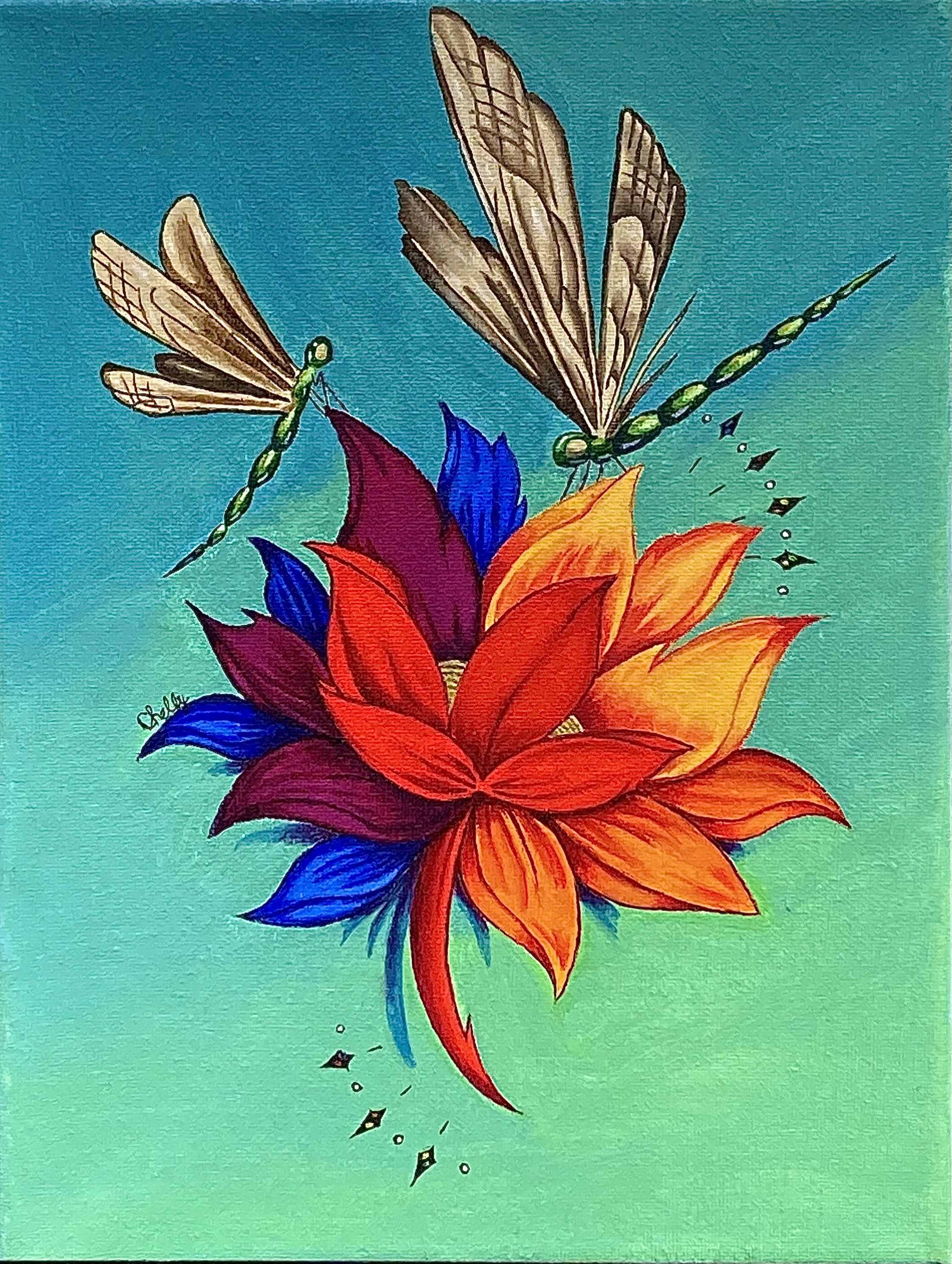 Dragonflies and the Fiery FlowerMedium: Oil on Canvas