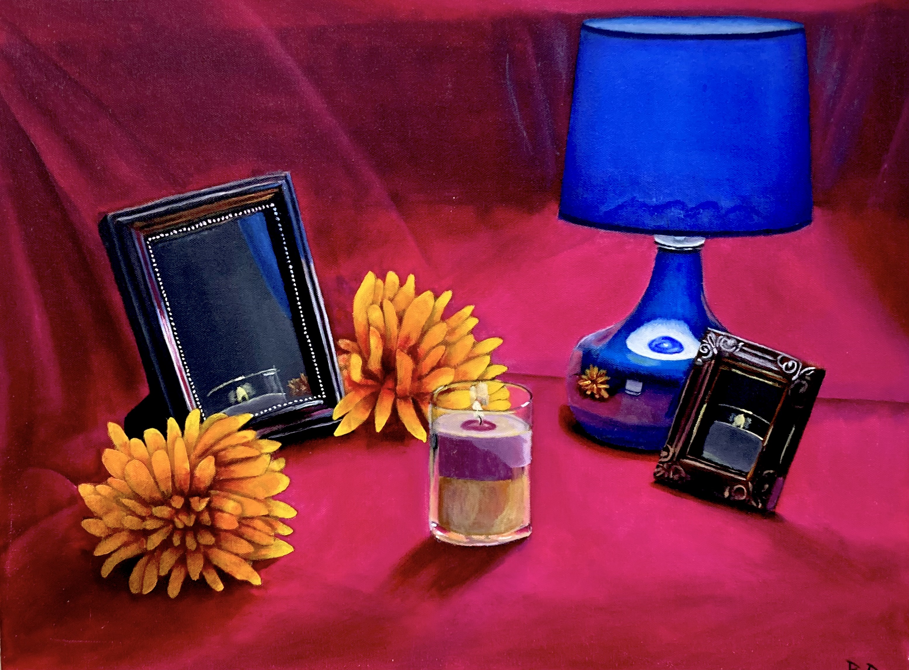 This painting was my attempt of trying oil painting for the first time in colors. I decided to choose the theme of Fall (or Autumn), which is my most favorite season, and used primary colors (mainly red & yellow, with a splash of blue) to start off my painting journey. Pumpkins and squashes are known to symbolize Fall. Red fabric is included to surround the objects to give its presence a warm feel, while a blue bottle is placed in the center of the painting to give viewers a place to rest their eyes and embrace its cooling space.